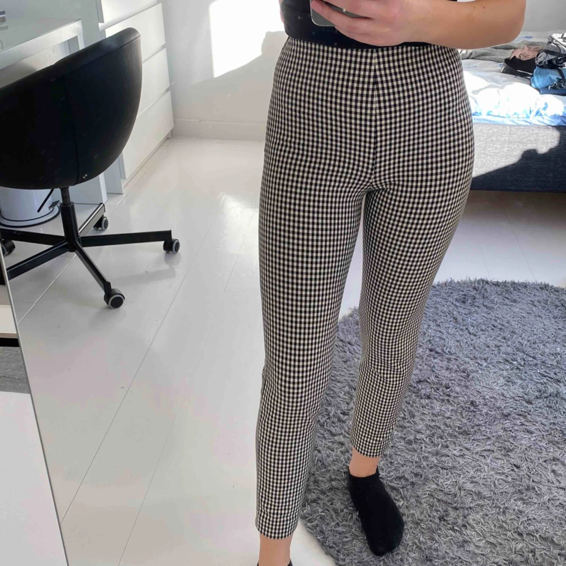 Oanvända väldigt stretchiga kostymbyxor med hög midja. Resår i midjan och dragkedja på sidan. Byxorna är i strlk 34 men är större då de är väldigt stretchiga. Passar även större ca (36)