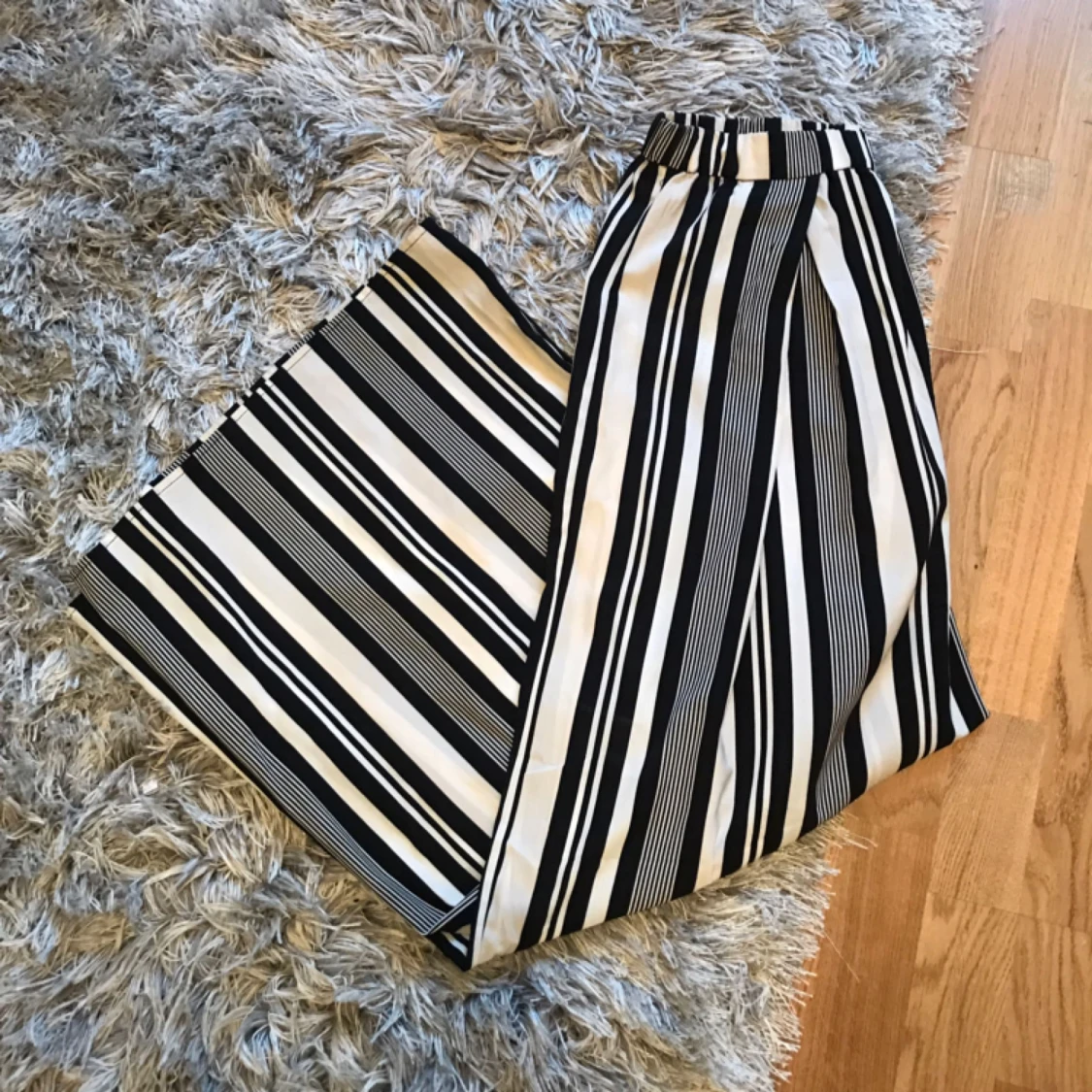 Vida svartvitrandiga byxor i skönt, tunt tyg. Köpta här på plick, men aldrig använda av mig. Den tidigare ägaren har dock gjort två små fläckar, en i grenen (så den syns inte när plagget är på) och en liten längst ner på baksidan av ena benet (se bild). Fraktkostnad tillkommer!
