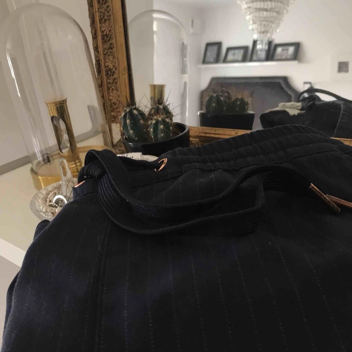 Sparsamt använda kritstrecksrandiga byxor. Inget fel på dom, de är bara för små.
