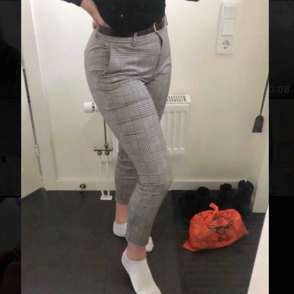 Rutiga kostymbyxor med fickor fram, de bak är fake De är i 42 men skulle säga M kanske L Använda ca 5 ggr och säljer då de är förstora Köparen står för frakt