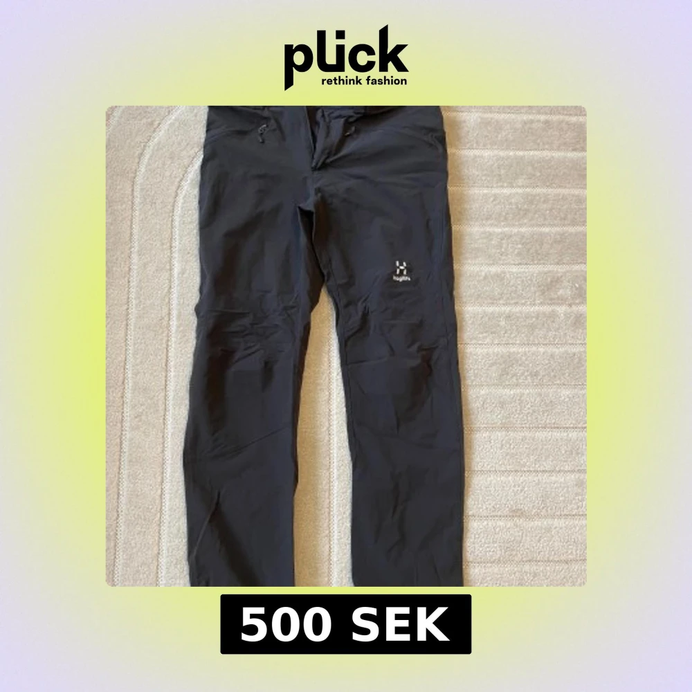 Svarta friluftsbyxor från Haglöfs i storlek M. Byxorna har raka ben, dragkedjor vid fickorna och är tillverkade i ett slitstarkt syntetmaterial. Perfekta för utomhusaktiviteter och äventyr.