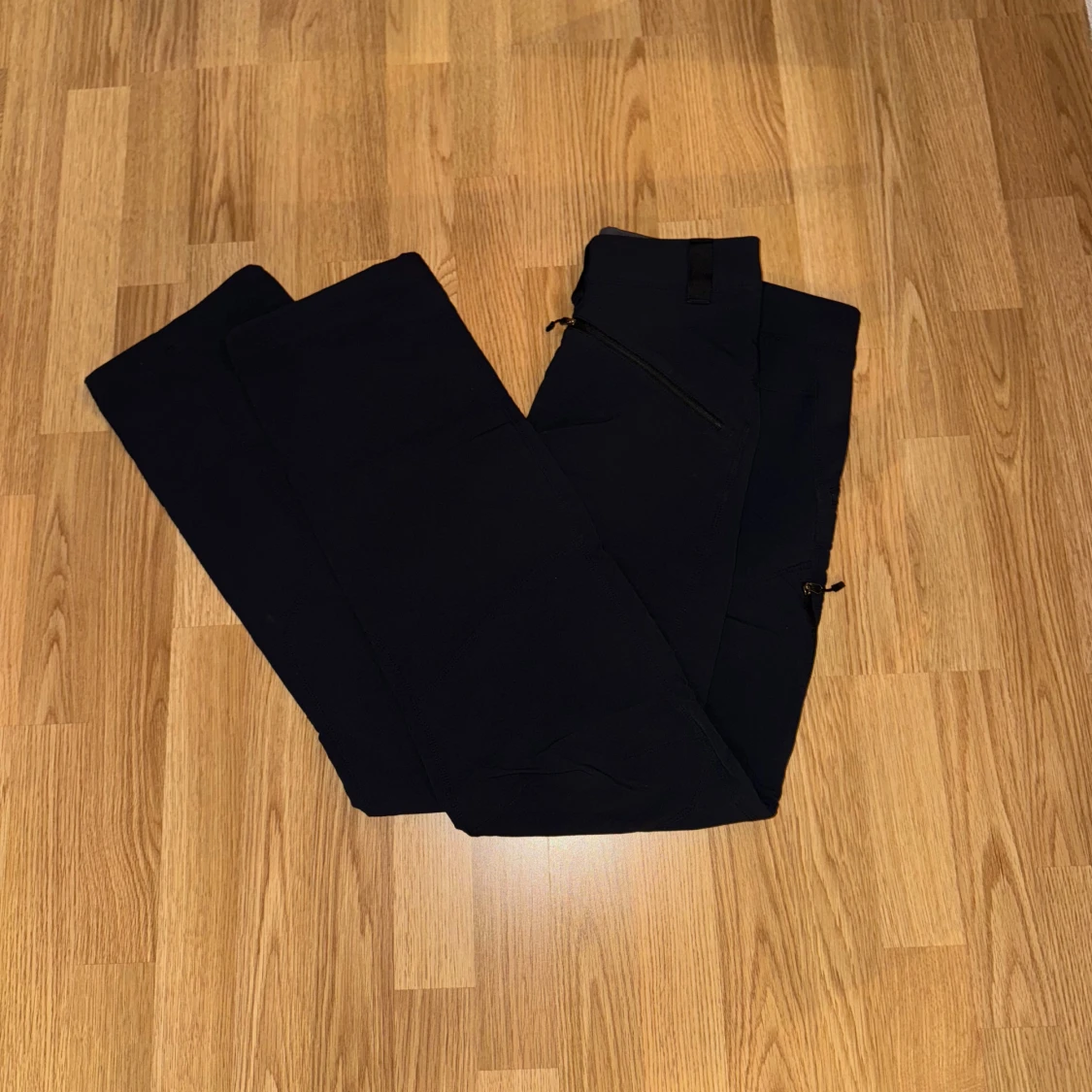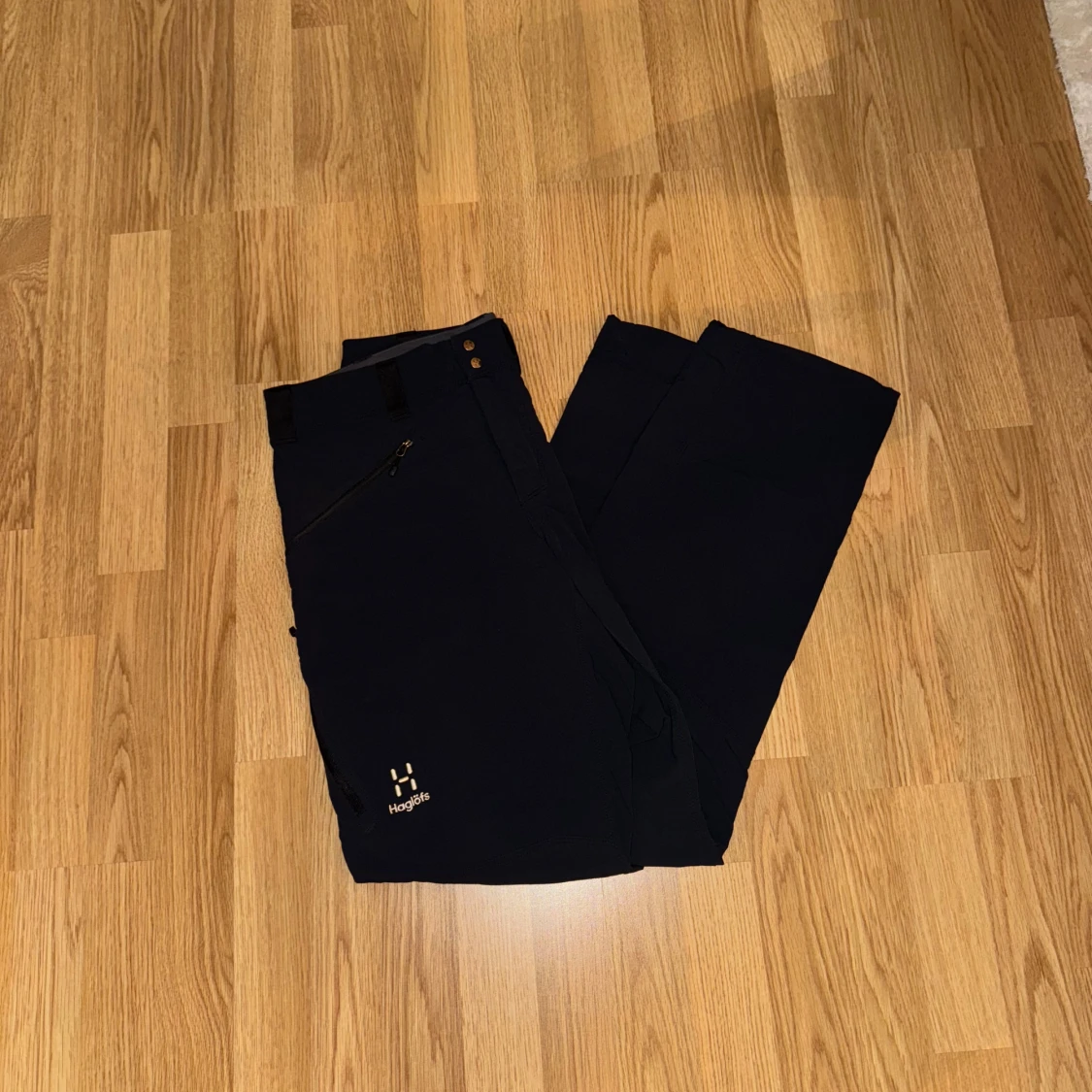 Svarta täckbyxor från Haglöfs med dragkedja vid fickan och diskret logga på benet. Byxorna har raka ben och är perfekta för utomhusaktiviteter under kallare säsonger. Snygg och funktionell design med praktiska detaljer.