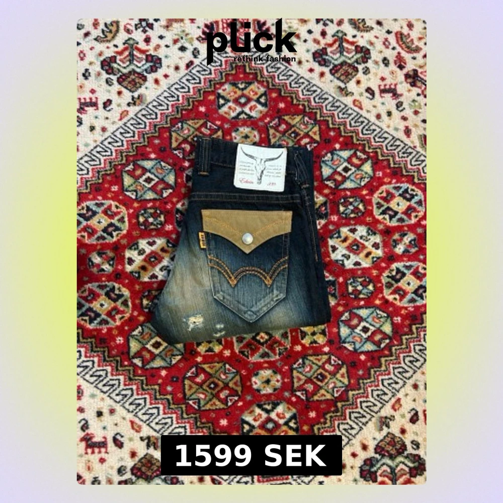 Jättesnygga och unika jeans ifrån edwin. Jeansen är rätt så mörka, mörkt blå. Bakom hålen så är det påstruket svart tyg så man inte ska se igenom, detta har gjorts professionellt. Alla hål är fixade. Lätt använda. Storlek M. Mått: 106 cm längd. 40 cm midja. 25 cm benöppning