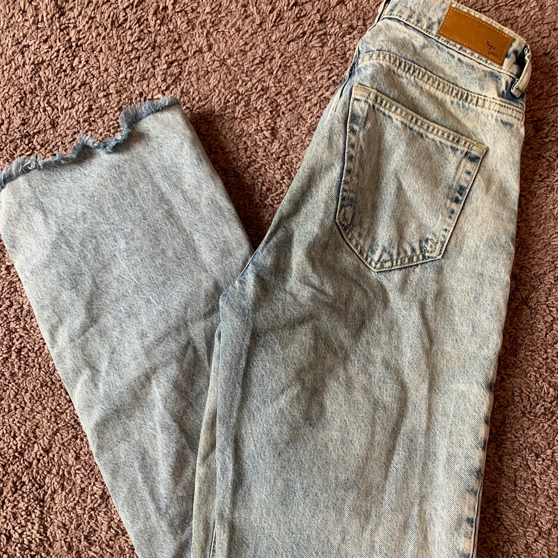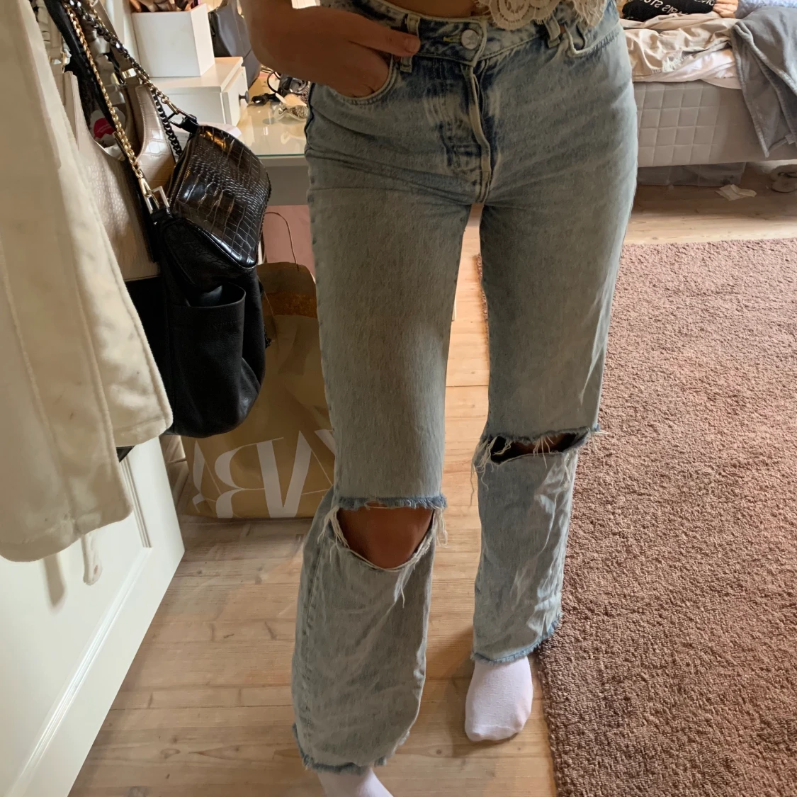 Ett par snygga ljusblå jeans från BikBok i storlek 27. Jeansen är högmidjade med hål på knäna. Passar mig i längden som är 175cm. Köpta för 599kr. Säljer för 250kr + frakt❣️❣️