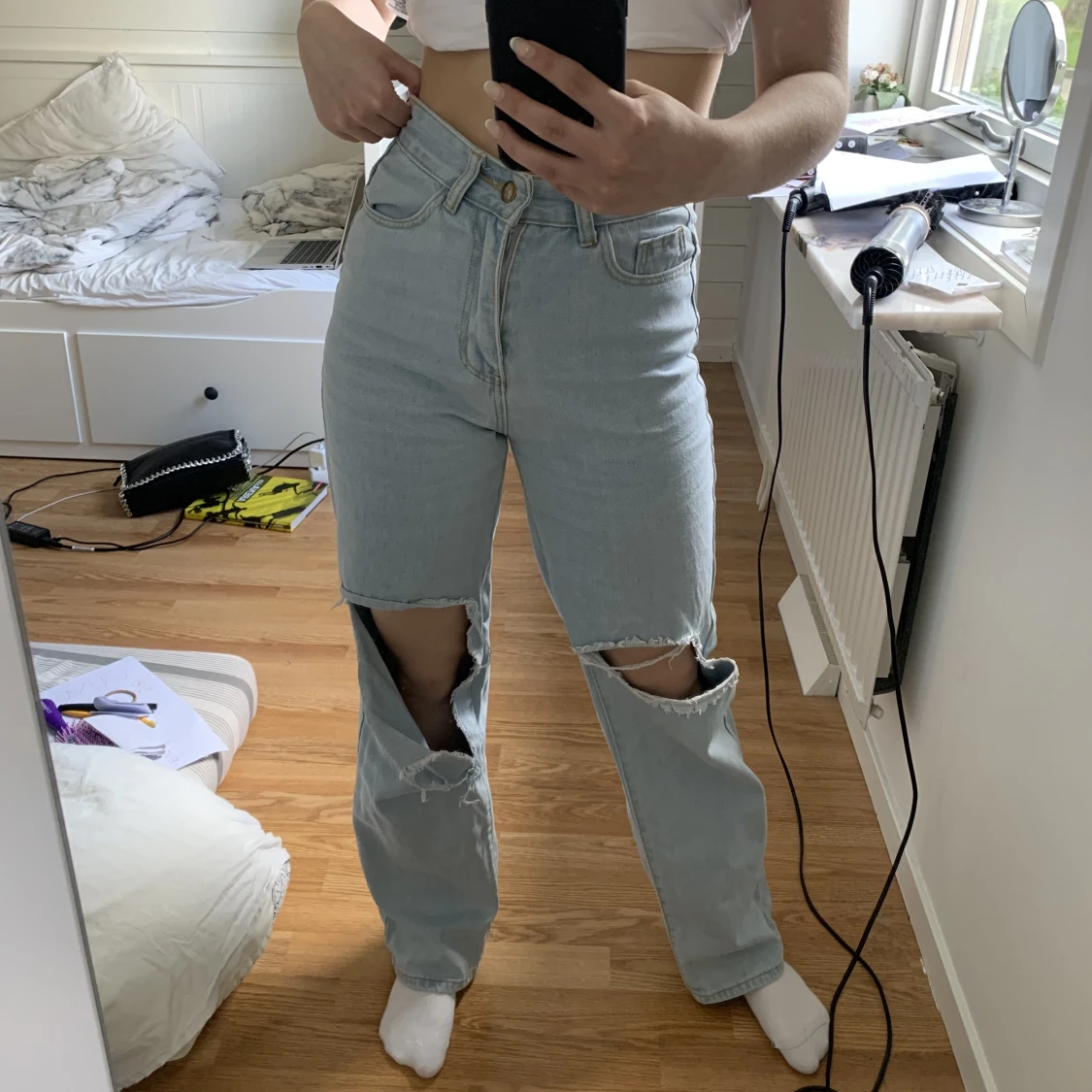 Ett par jeans med hål på knäna, i en jätte fin ljusblå färg