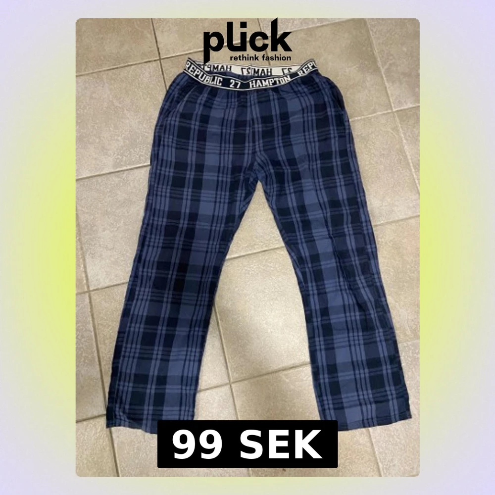 Säljer ett par blårutiga byxor från Hampton Republic med elastisk midja och logotypdetaljer. Byxorna har en avslappnad passform och är gjorda i mjukt bomullsmaterial, perfekta för chill dagar hemma. Snyggt rutmönster i mörkblå toner. Sparsamt använda, så fint skick.