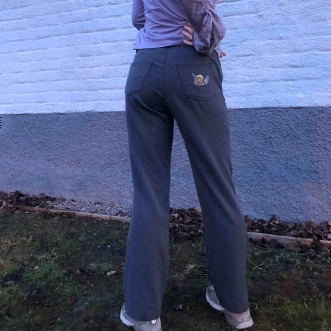 Supersnygga och sköna byxor med handmålad ängel! Passar mig med storlek S men skulle även passa en M Jag är 169 cm lång💞
