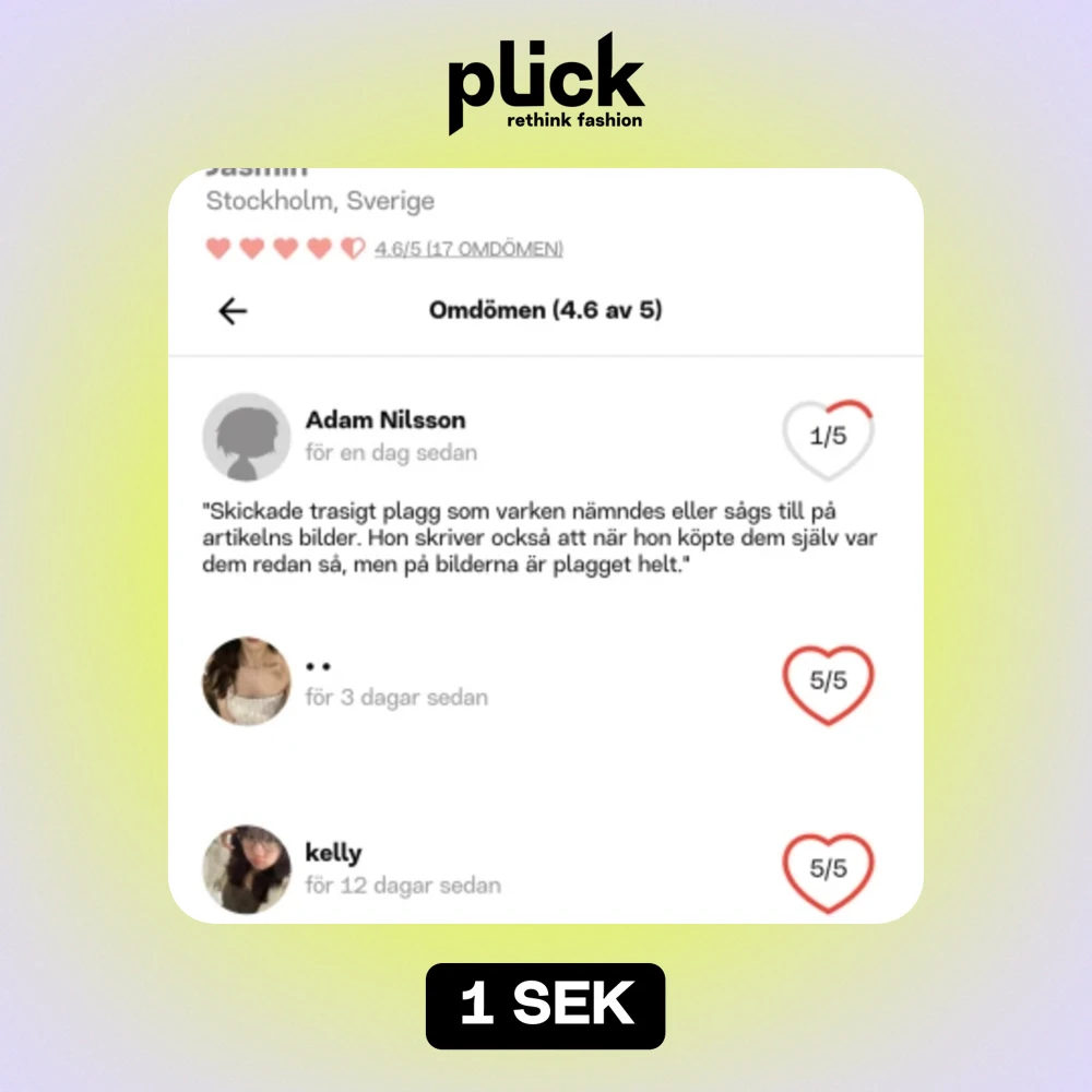 Vid köp på plick appliceras alltid ett köparkydd som täcker eventuella fel med varan eller leveransen. För att köparskyddet ska gälla måste köpet reklameras via plick-appen inom 24 timmar från att varan har mottagits. Läs mer här.