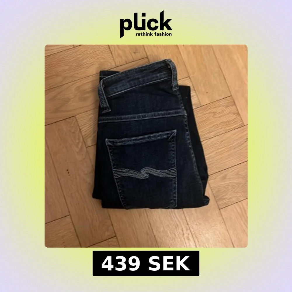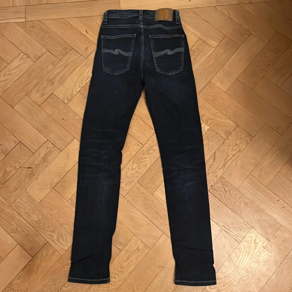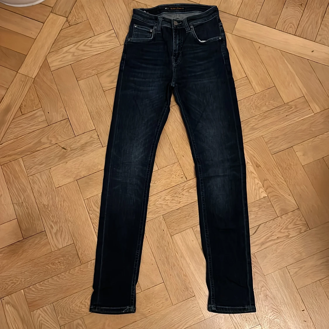 Helt nya Nudie jeans i skick 10/10. Byxorna har aldrig varit använda förutom när jag testade dom. Modellen är skinny lin. Dom har en stilren mörkblå färg. Storlek W27 L30 men sitter mer som W26-W25. Byxorna passar någon som är ungefär 165