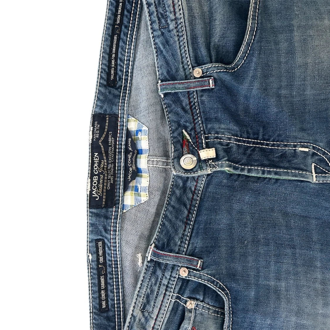 Snygga blå jeans från Jacob Cohën med klassisk femficksdesign. Jeansen har vita och röda kontrastsömmar, detaljer i italienska färger vid bakfickan och en exklusiv skinnpatch bak . Jeansen är helt utan defekter och är i 10/10 skick. Storlek (36) sitter mer som 34/34. Måtten är : 115 cm långa : innerbens längd 85 cm och ben öppningen är 18 cm. Midjemått ca 45 cm Jeansen kostar 10 000 + nya, hör av mer vid frågor och pris !
