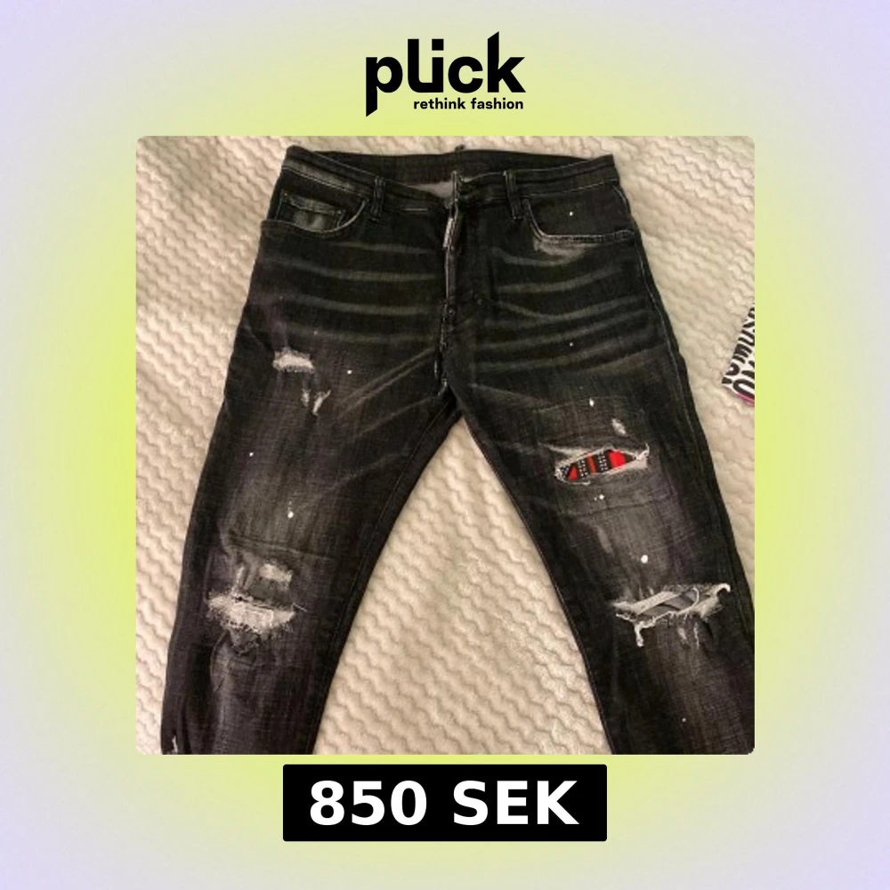 Säljer ett par svarta jeans från Dsquared2 med slitningar, färgstänk och patch-detaljer. Jeansen har fem fickor, knappgylf och en rak passform. Märkeslogga på baksidan och coola trasiga detaljer framtill.