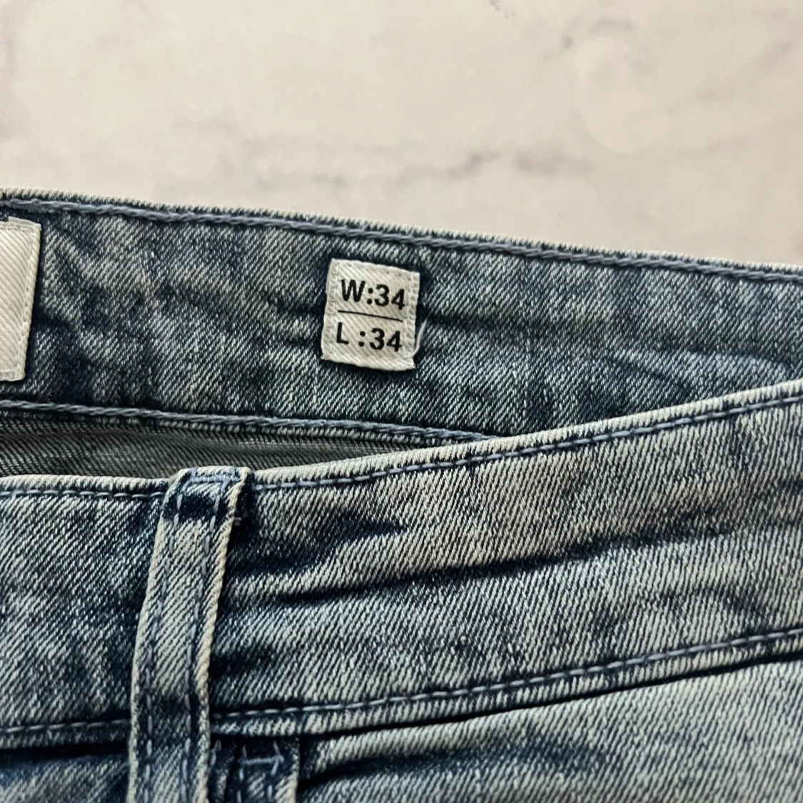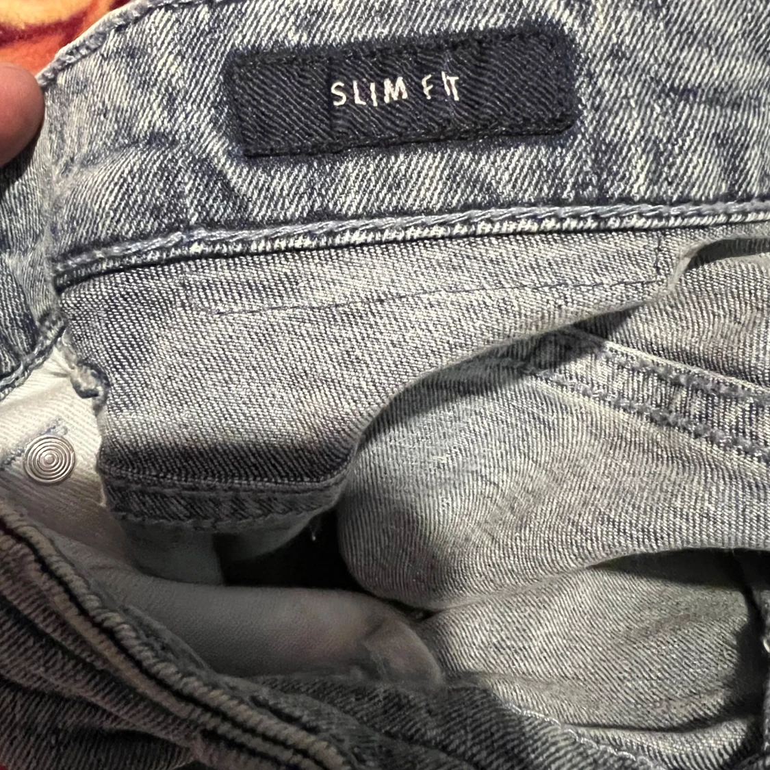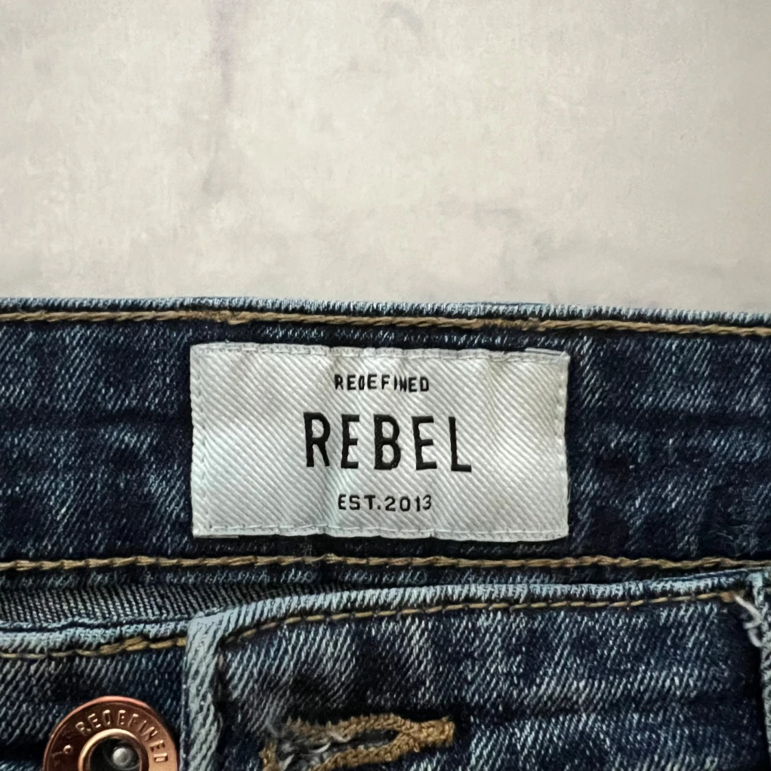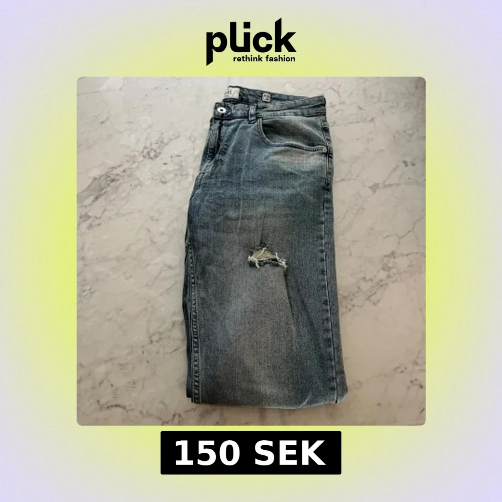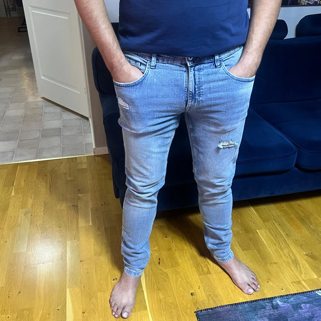 Säljer ett par grå jeans från Rebel med slitningar och hål på ena benet. Klassisk femficksmodell med dragkedja och knapp. Raka ben och normal passform. Storlek W34 L34.
