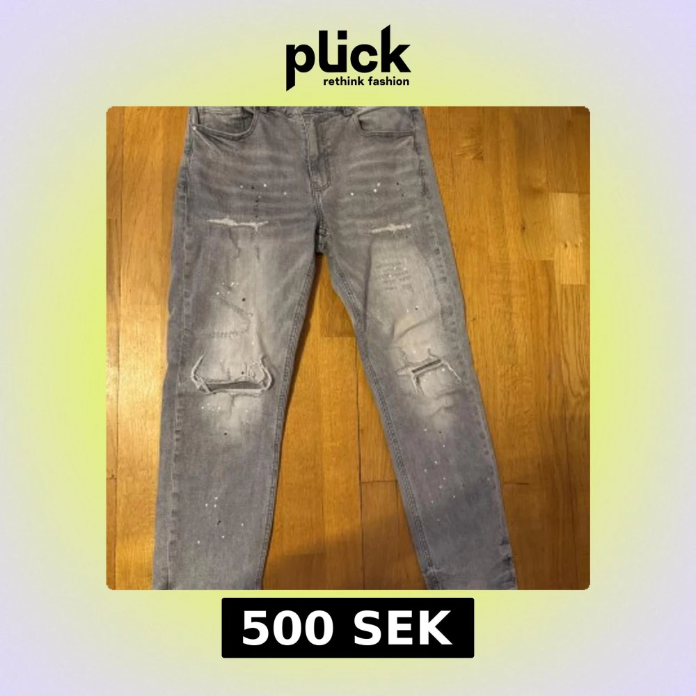 Säljer ett par grå jeans från Supply & Demand med slitna detaljer och färgstänk på framsidan. Byxorna har fem fickor, normal passform och klassisk knappgylf. Perfekta för en avslappnad streetstil.