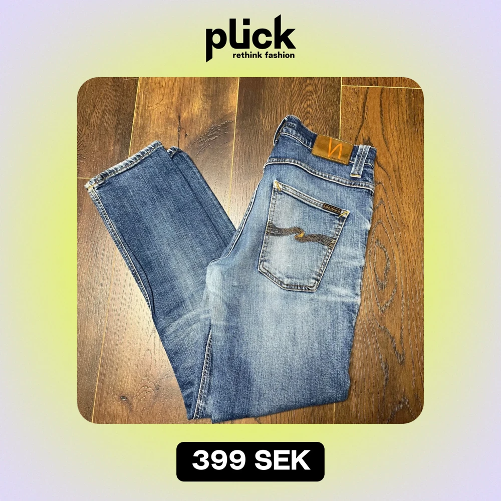 Säljer ett par snygga blå jeans från Nudie i bra skick. Storlek W32, L30, De har en klassisk femficksdesign med en cool broderad detalj på bakfickan. Jeansen är i en straight passform och har en dragkedja. Perfekta för både vardag och fest!