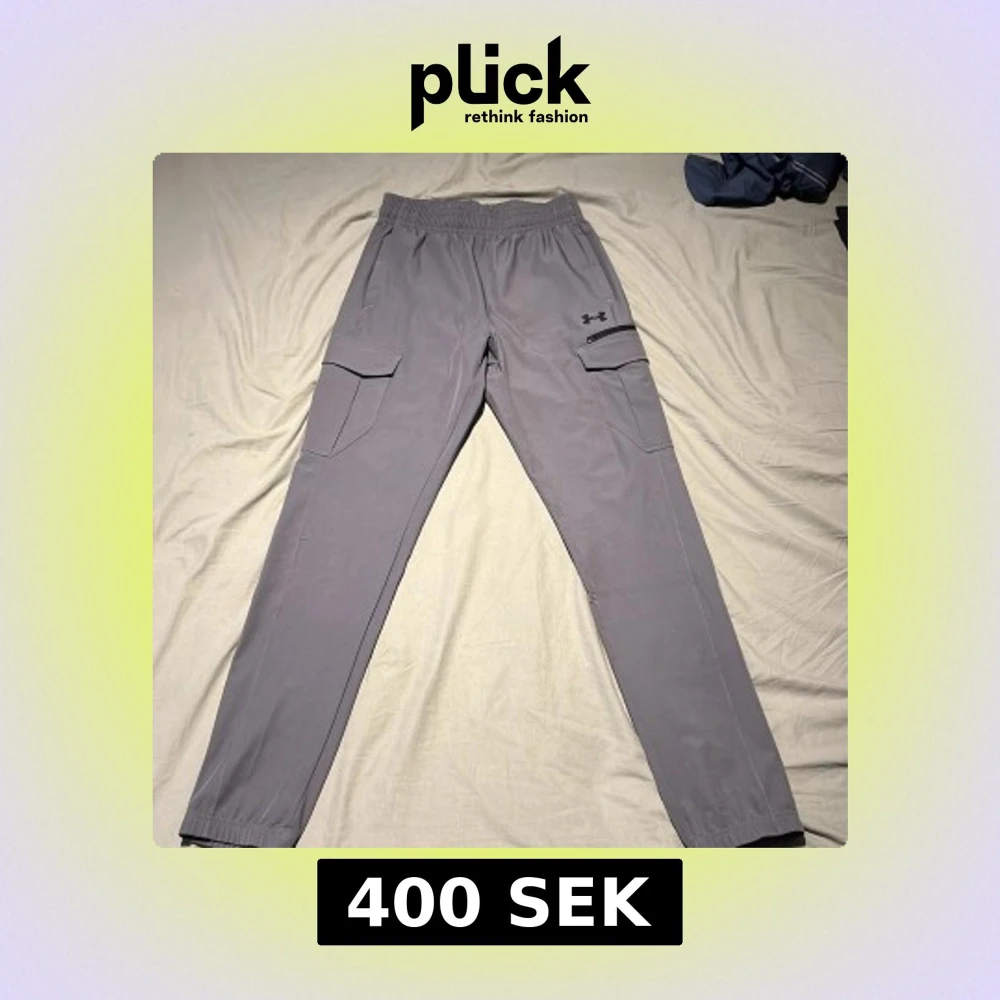 Säljer ett par grå cargobyxor från Under Armour med elastisk midja och muddar vid benslut. Byxorna har två stora fickor med lock på sidorna och är perfekta för en sportig och avslappnad stil.