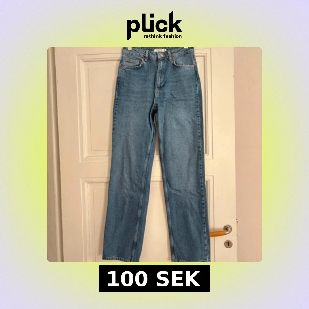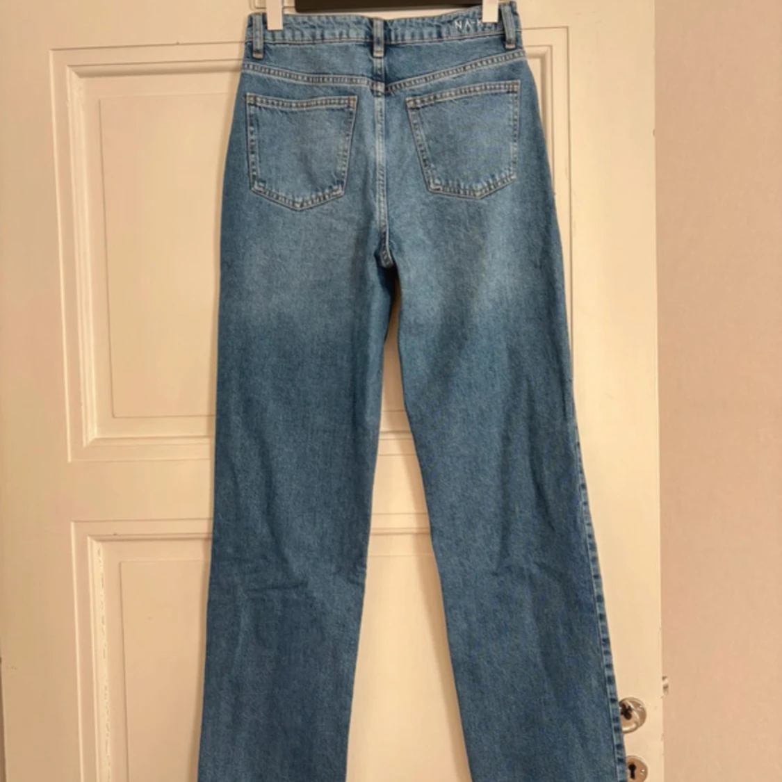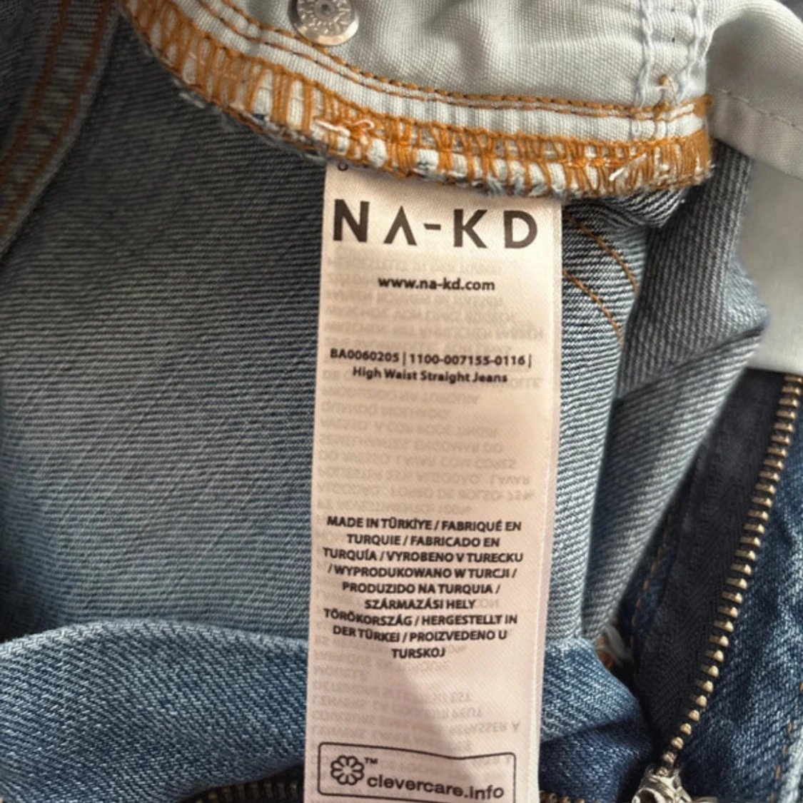 Blå high waist straight jeans från NA-KD i klassisk denim med fem fickor och orangea sömmar. Jeansen har en rak passform och stängs med dragkedja och knapp framtill. Perfekta för en avslappnad och trendig look.