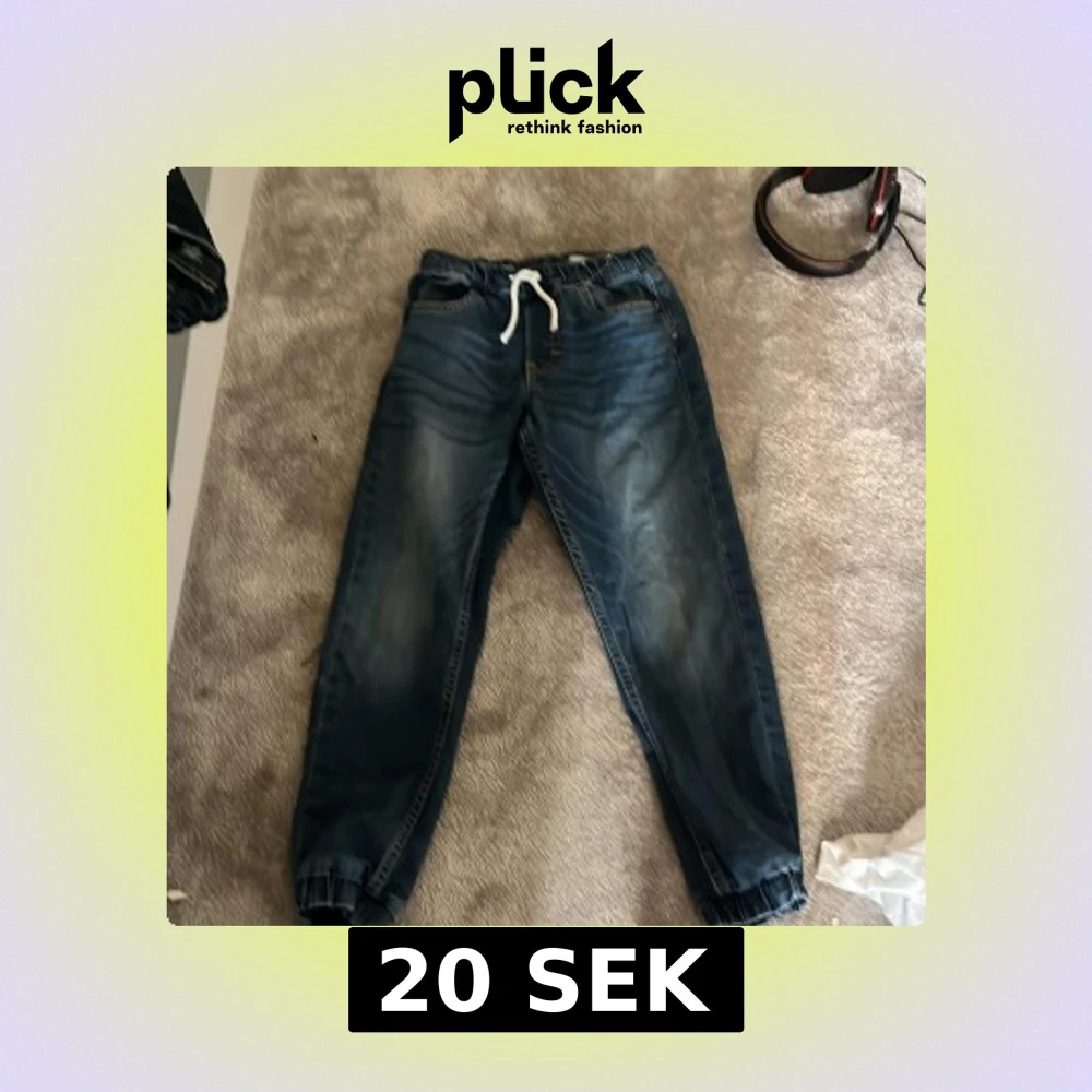 Säljer ett par blå joggerjeans från H&M med elastisk midja och vit snörning. Byxorna har resår vid bensluten och två bakfickor. Supermjukt material som är bekvämt att ha på sig.