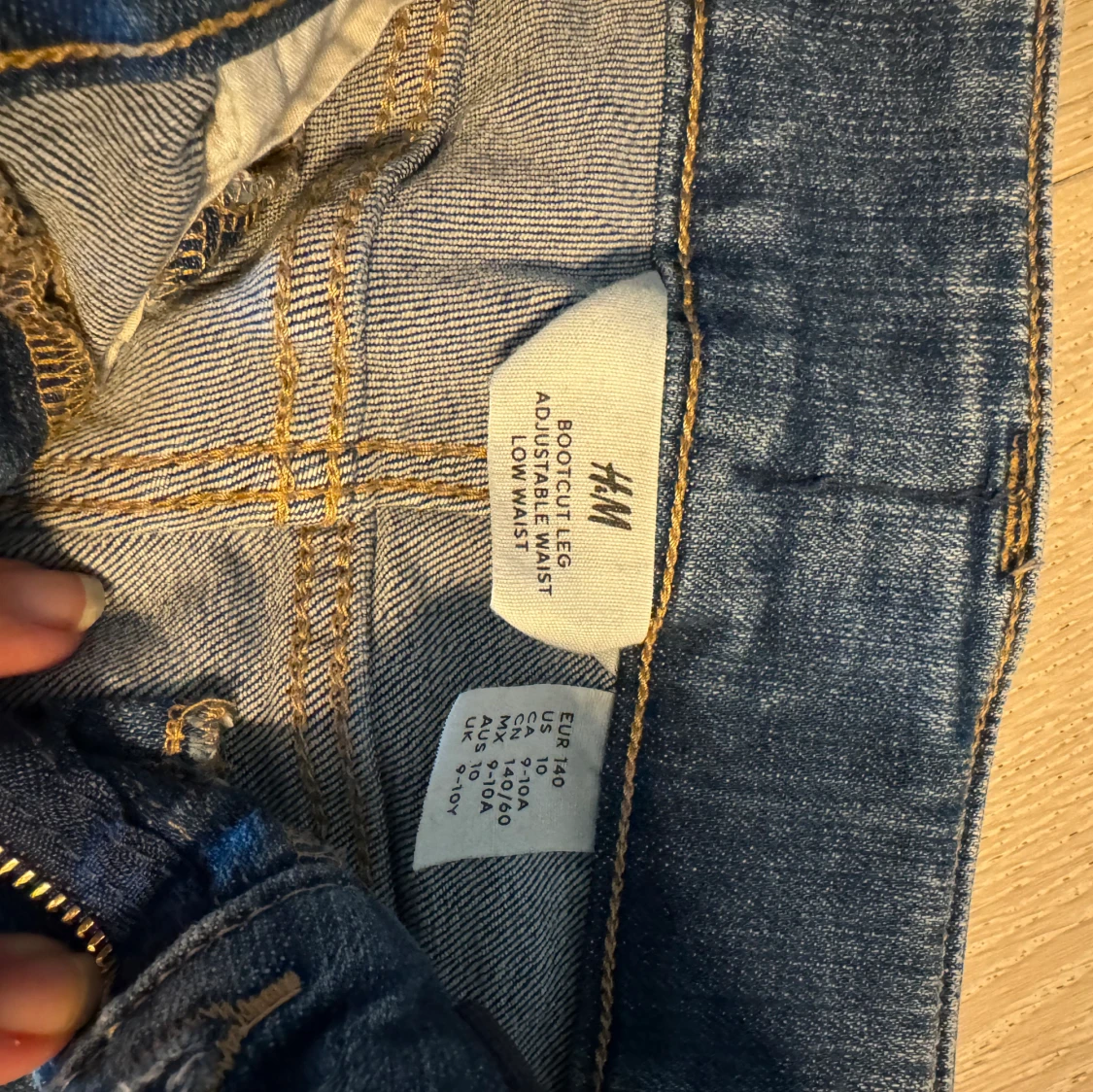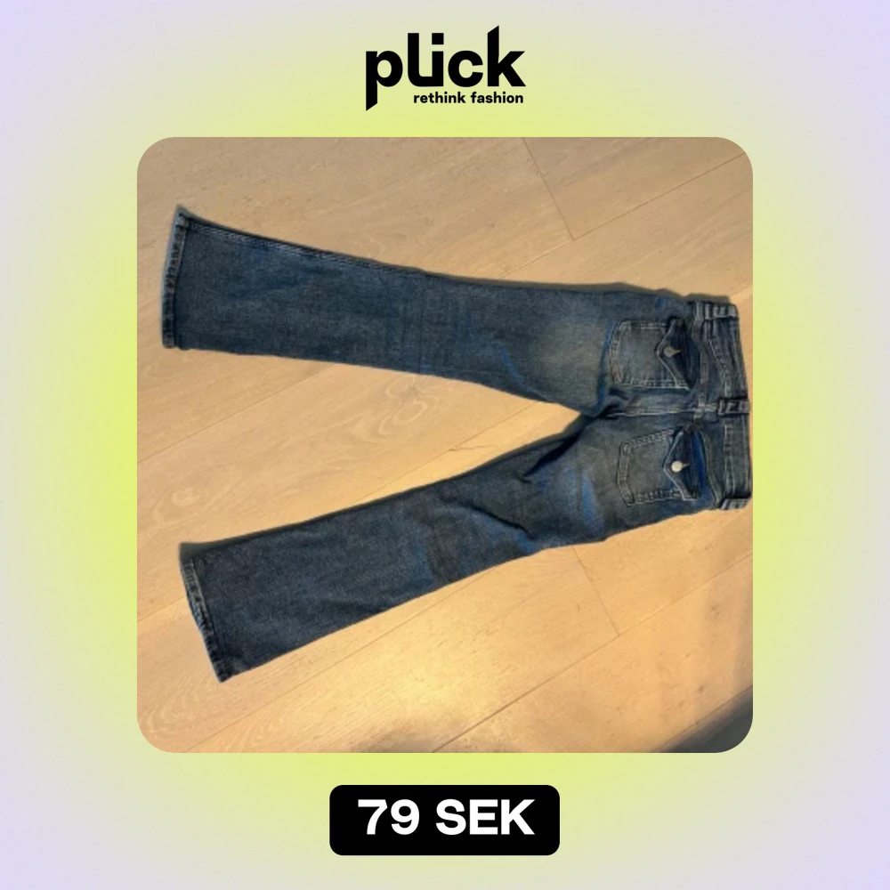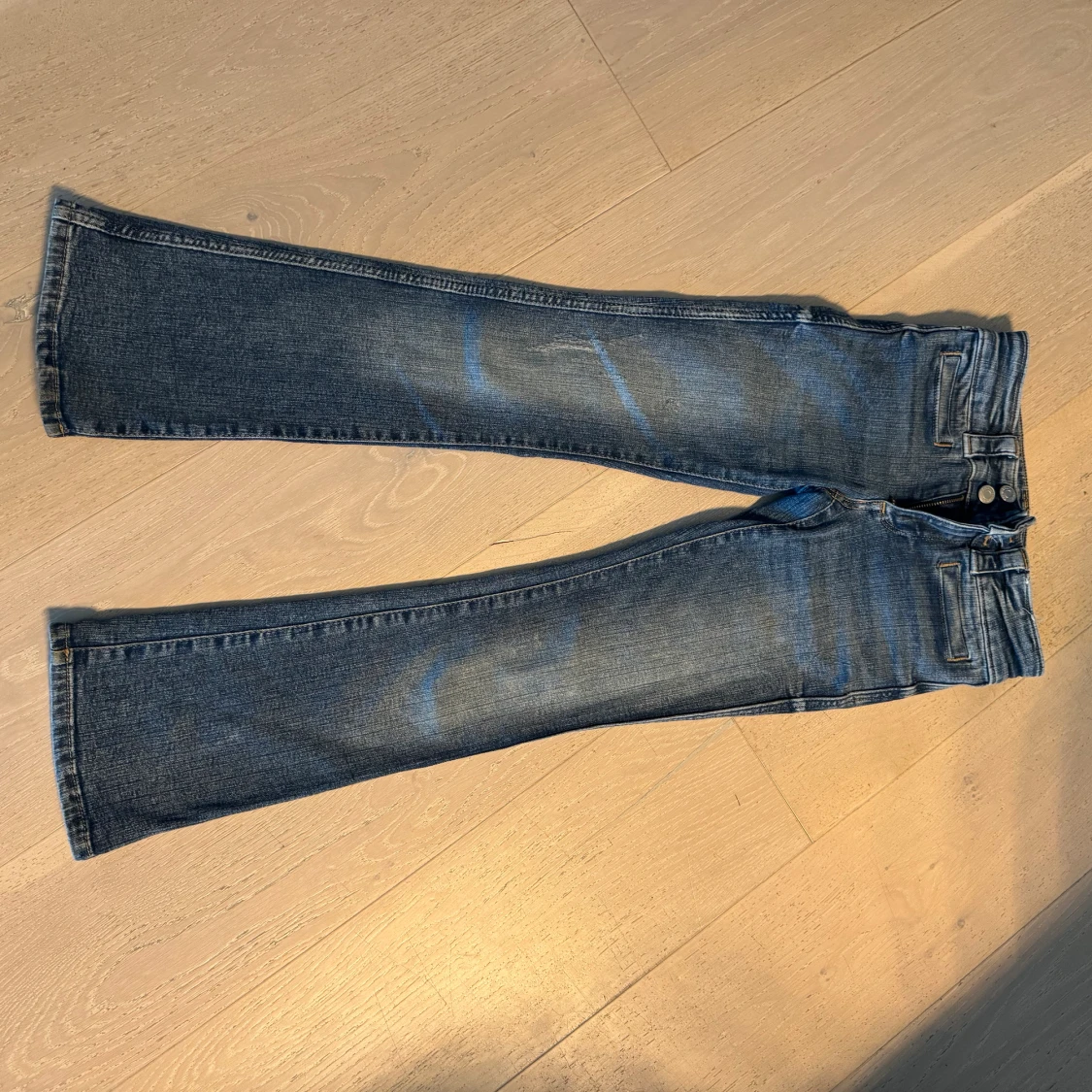Blå jeans med knappar på bakfickorna