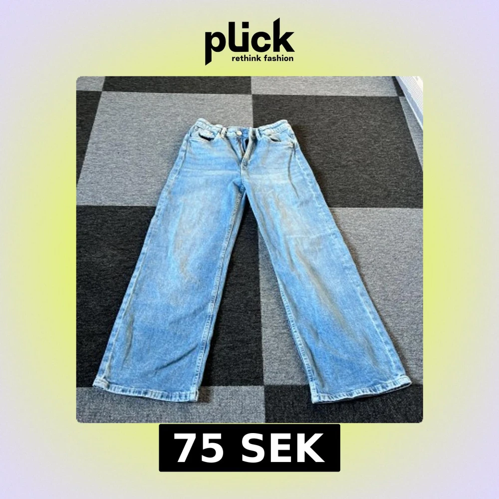 Säljer ett par blå wide leg jeans från H&M med justerbar midja och hög midja. De har en dragkedja och knapp framtill. Perfekta för en avslappnad stil.