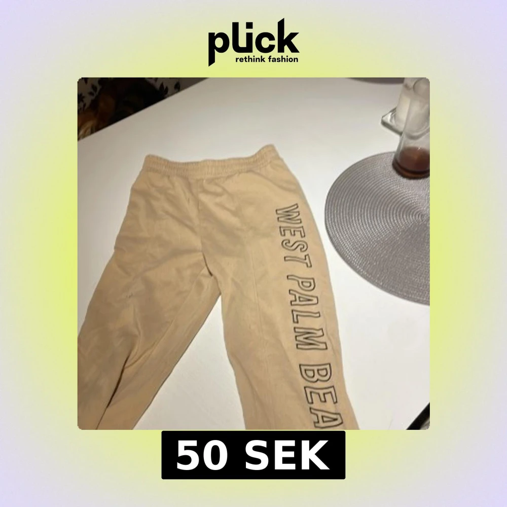 Beiga mjukisbyxor från H&M i storlek 140 med trycket 'WEST PALM BEACH' längs ena benet. Byxorna har resår i midjan och är gjorda i mjukt bomullsmaterial, perfekta för en avslappnad stil.