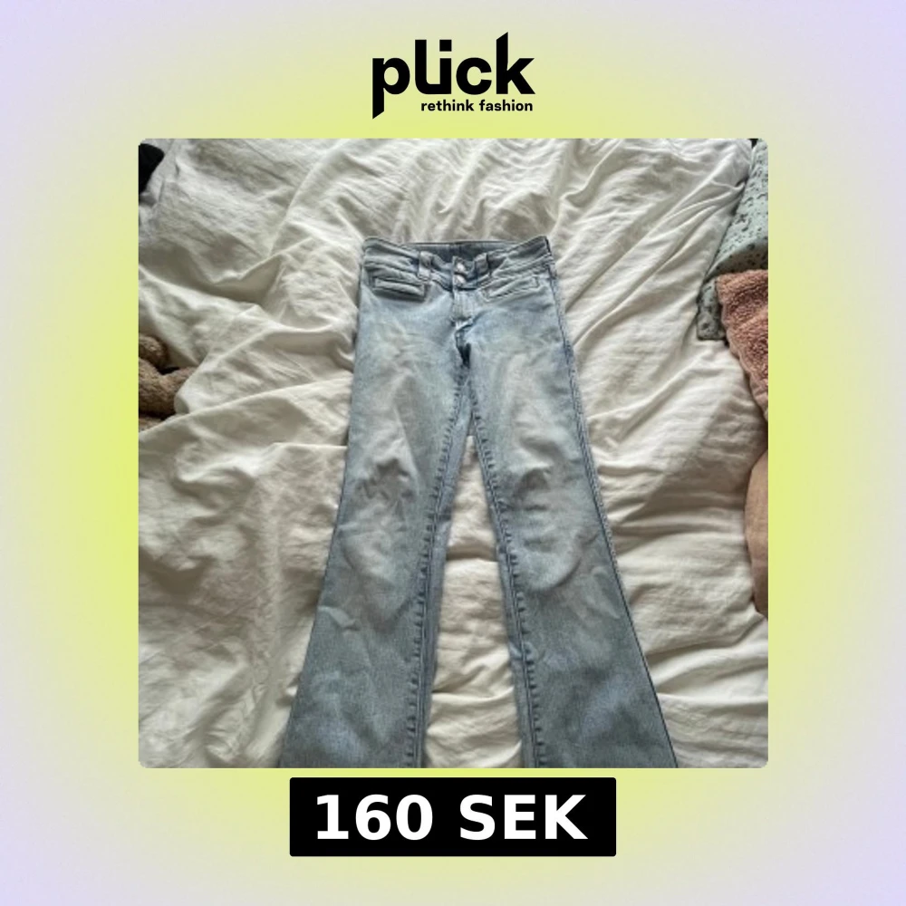 Snygga ljusblå jeans med bootcut-modell och dubbla knappar i midjan.