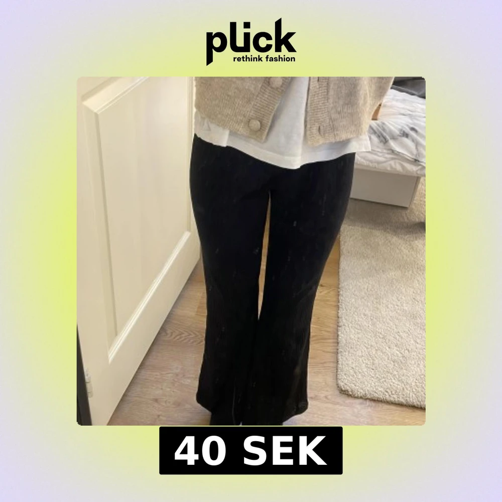 Svarta ribbade byxor från H&M med utsvängda ben. Byxorna har en mjuk och stretchig känsla, perfekta för en avslappnad och trendig stil. Passar dig som gillar bekväma men snygga plagg.