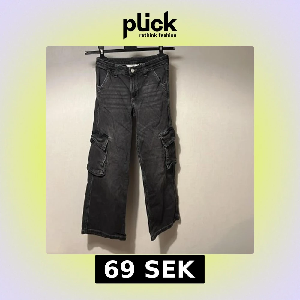 Svarta cargobyxor från H&M med raka ben och låg midja. Byxorna har flera stora fickor på sidorna och klassiska jeanssömmar. Tillverkade i bomullsmaterial med en cool, avslappnad look.