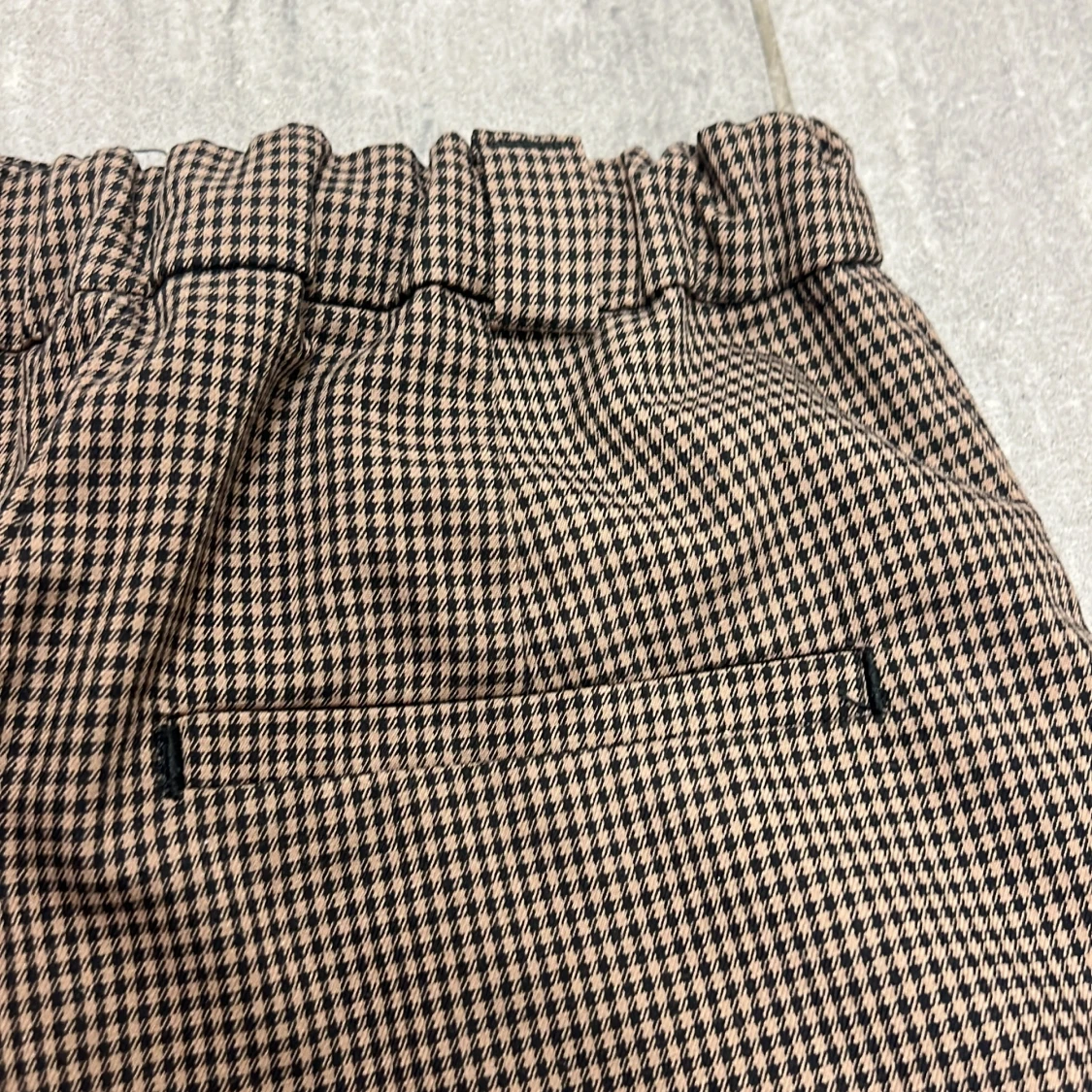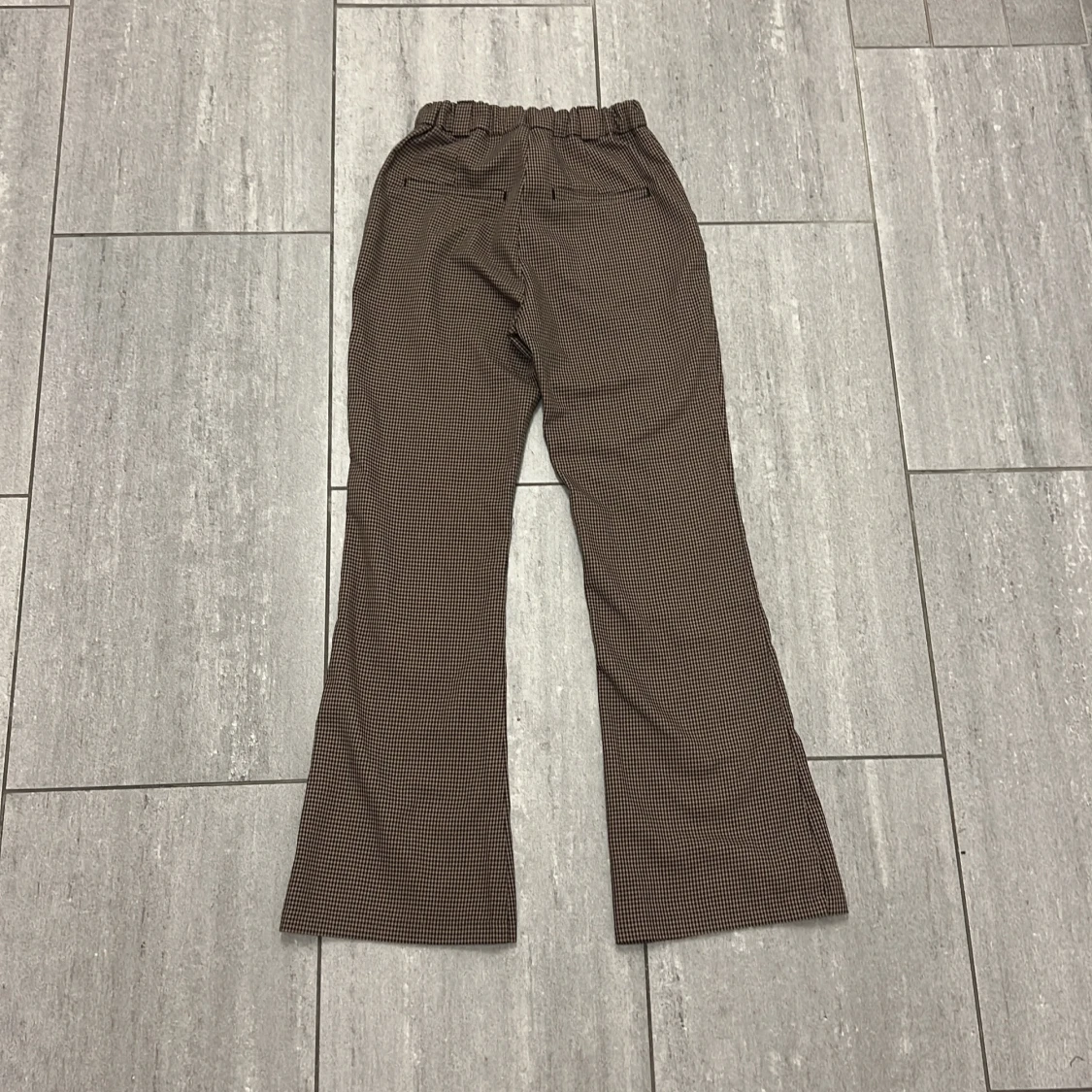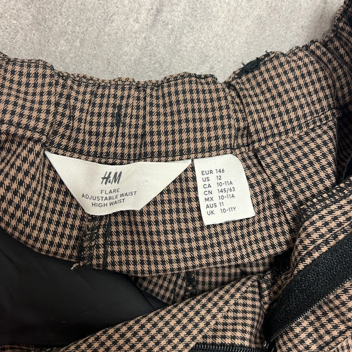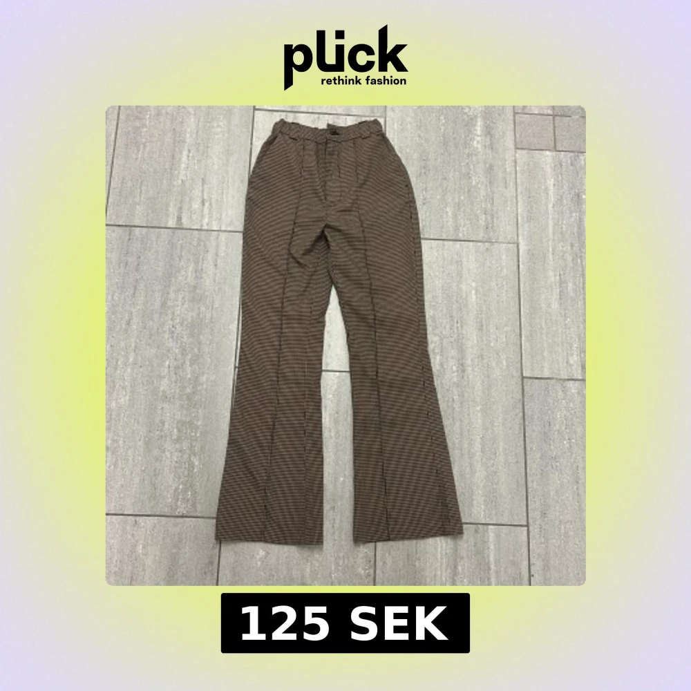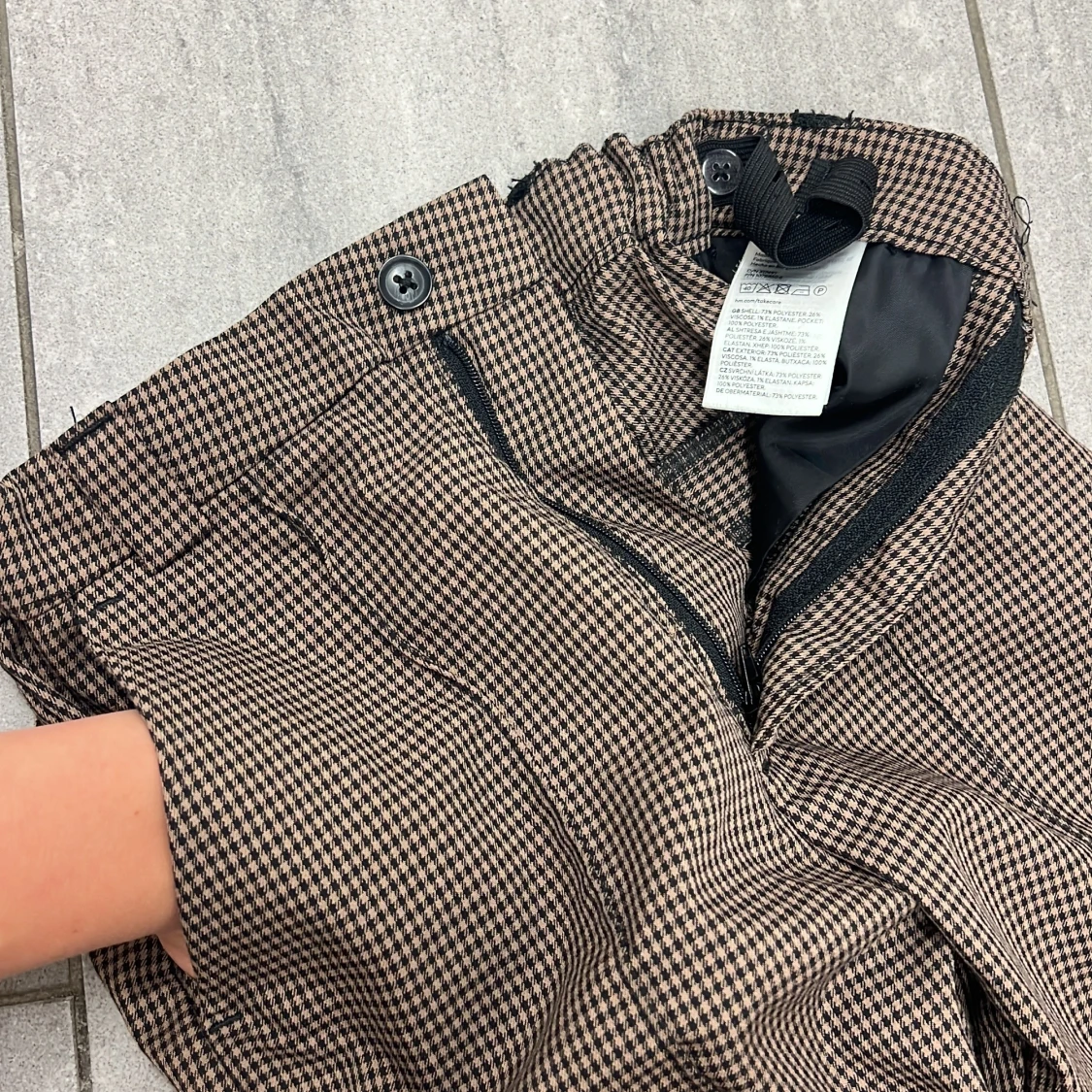 Snygga bruna flarebyxor från H&M med rutigt mönster och hög midja. Byxorna har justerbar midja, dragkedja och knapp framtill samt fickor. Perfekta för dig som gillar retrovibbar och vill sticka ut lite extra.
