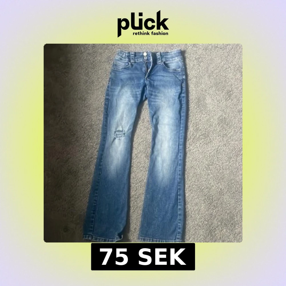 Snygga blå bootcut jeans från H&M med låg midja och justerbar midja. Jeansen har slitningar på ena benet, klassiska fickor fram och bak med knappar på bakfickorna. Tillverkade i bomullsmix för en skön känsla.