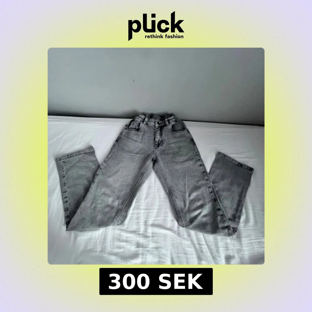 Säljer ett par gråa jeans med raka ben och hög midja. Jeansen har klassisk femficksdesign, bälteshällor och är tillverkade i ett mjukt denimtyg. Perfekt för alla årstider!