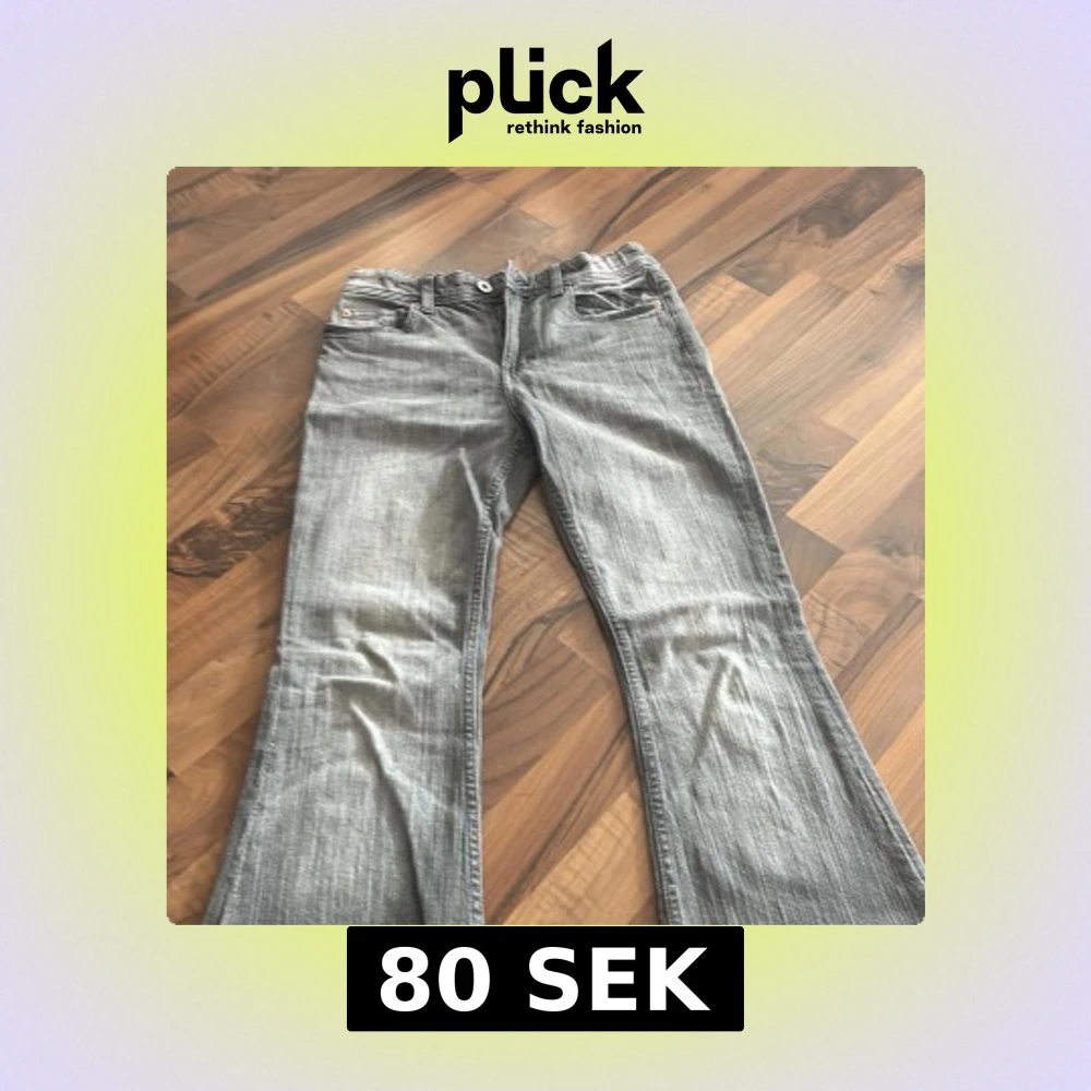 Snygga grå jeans från H&M i bootcut-modell med breda ben och klassiska fickor med knappdetalj bak. Jeansen har en cool tvättad look och är gjorda i mjukt bomullsmaterial. Perfekt för dig som gillar retrovibbar och vill sticka ut med en unik stil.