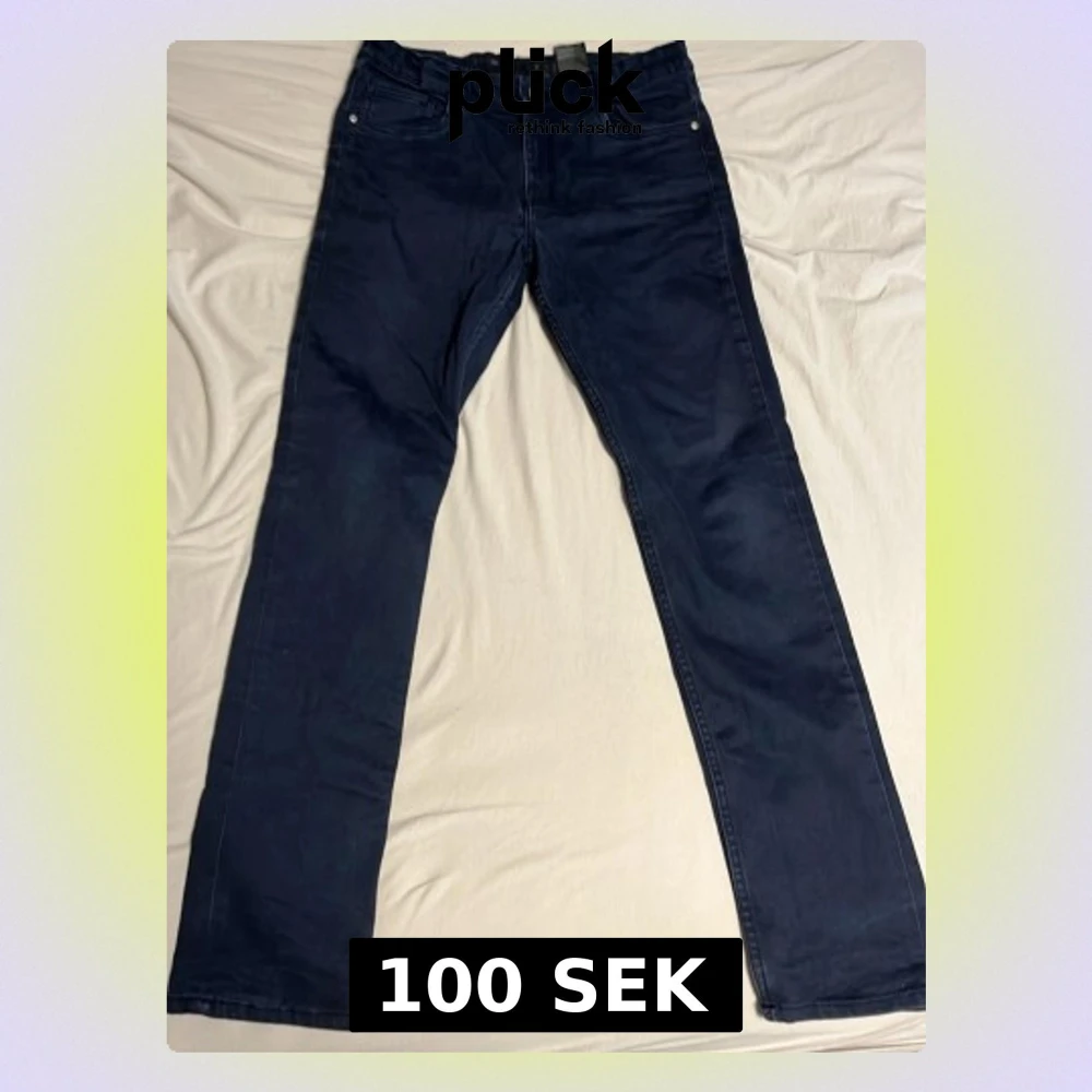 Snygga mörkblå slim fit jeans från H&M i storlek 164. Klassisk femficksmodell med justerbar midja och dragkedja med knapp. Jeansen är tillverkade i bomull med lite stretch för extra komfort. Perfekta till en avslappnad stil.