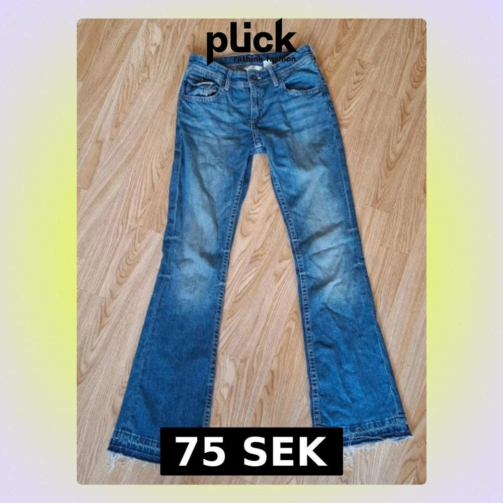 Snygga blå jeans från H&M med bootcut och låg midja. Jeansen har justerbar midja, klassiska fem fickor och cool broderad detalj på bakfickorna. 💕
