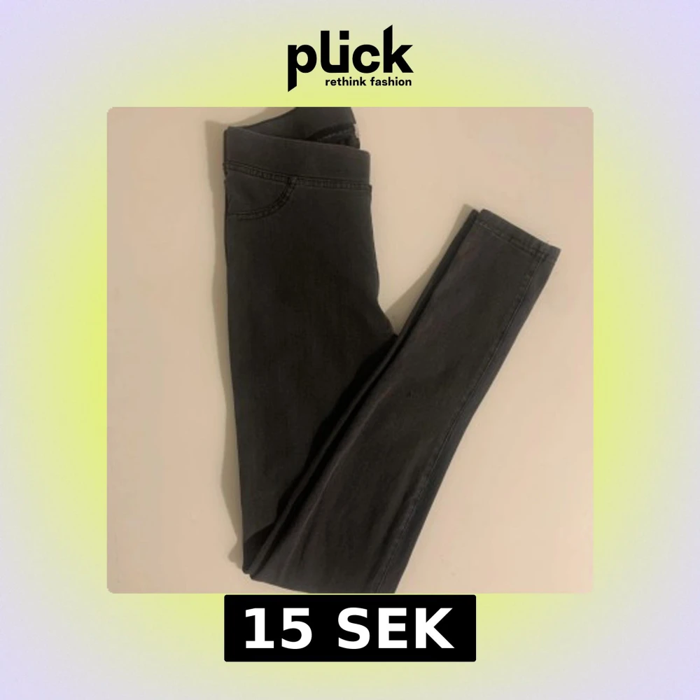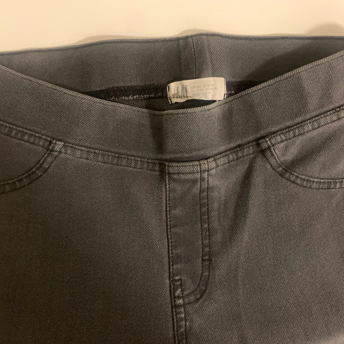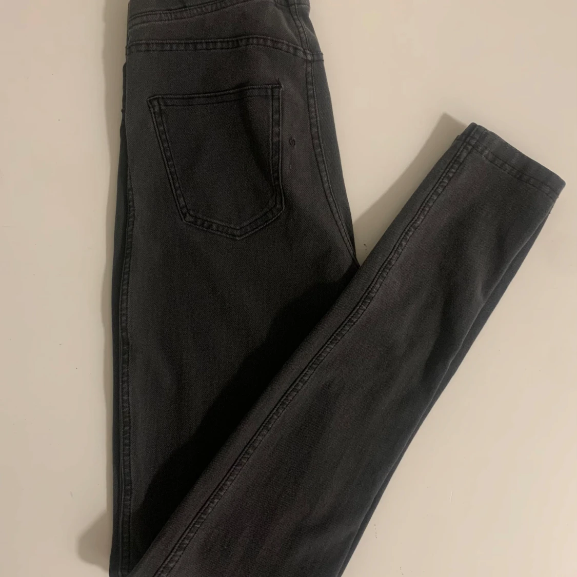 Snygga grå jeansleggings med en tight passform. De har en elastisk midja och ser ut som jeans med fickdetaljer. Perfekta för en stilren look.