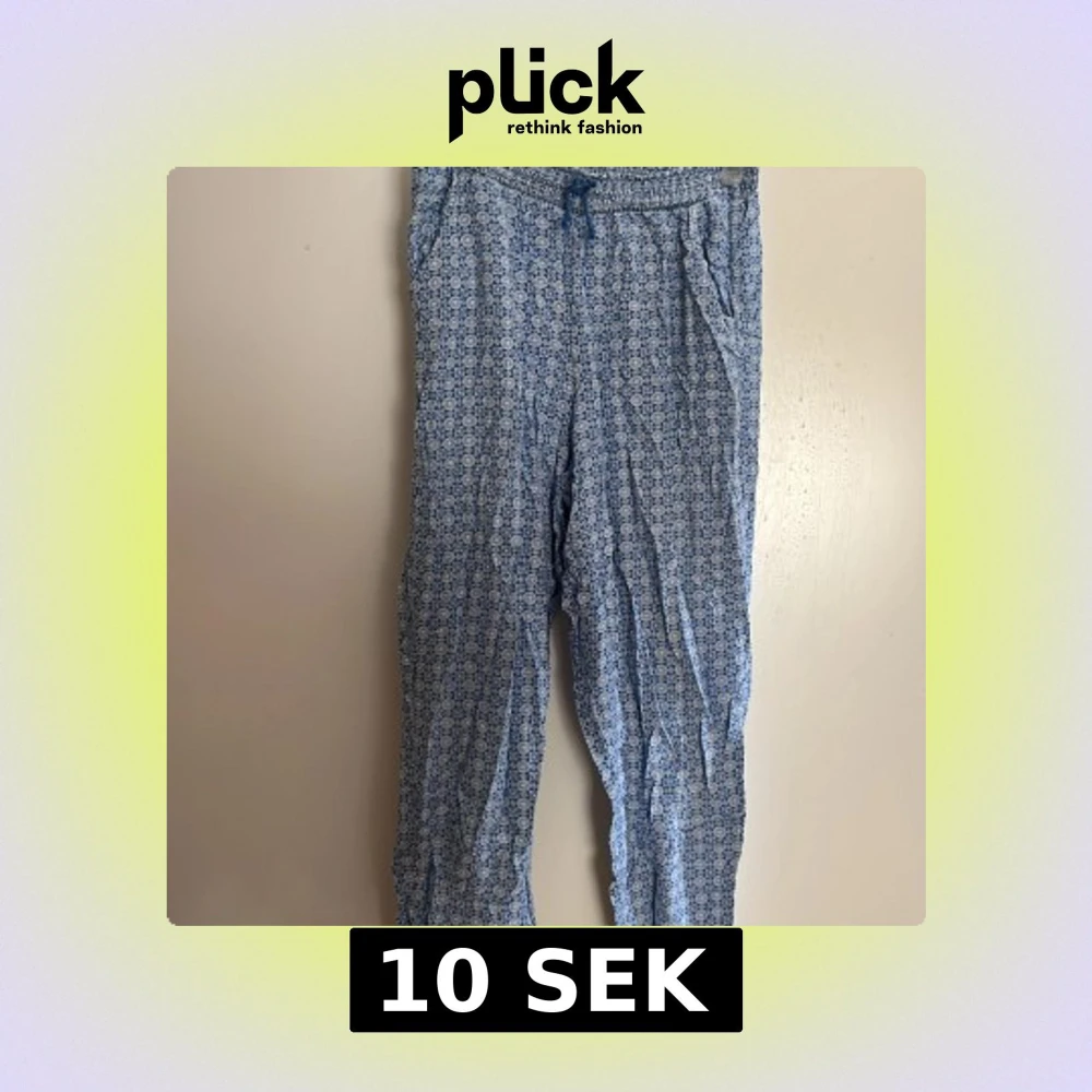 Snygga blå linnebyxor med vitt mönster och elastisk midja med knytning på framsidan. Lätta och luftiga, perfekta för varma dagar. Byxorna har avslappnad passform och sidfickor. 100% viskos, mycket sköna och luftiga.💙🤍