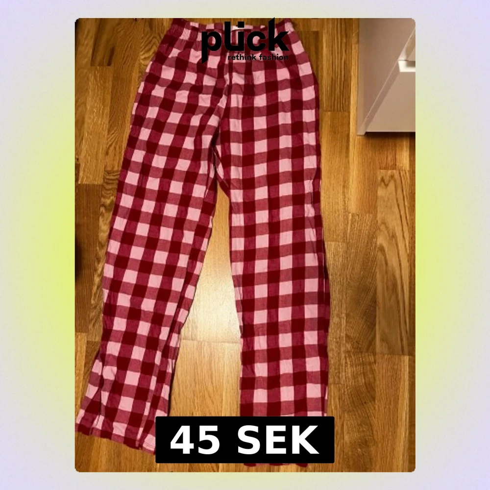 Säljer ett par röd- och rosa rutiga byxor från H&M i storlek 170. Byxorna har resår i midjan och är tillverkade i mjuk bomull, perfekta för chill dagar hemma. Klassisk rak passform och riktigt skön känsla.💕