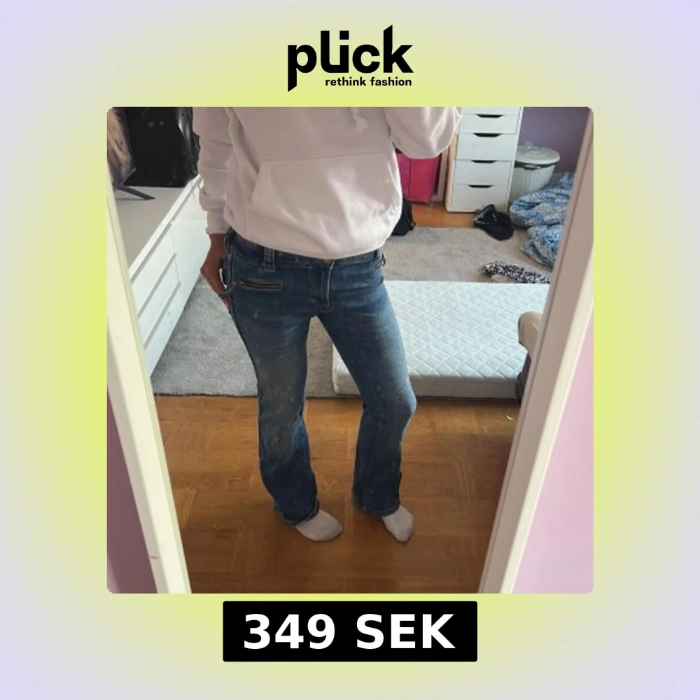 Säljer ett par blå bootcut jeans från H&M med låg midja och justerbar midja. Jeansen har dragkedjedetaljer framtill och klassiska bakfickor. Materialet är en mix av bomull, polyester och elastan för en skön passform.