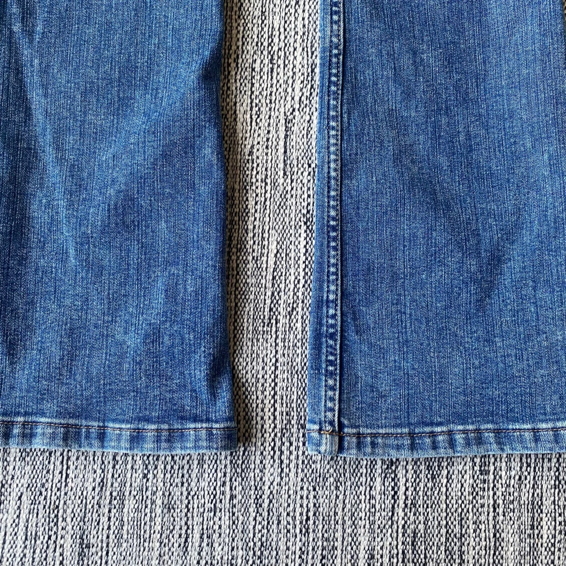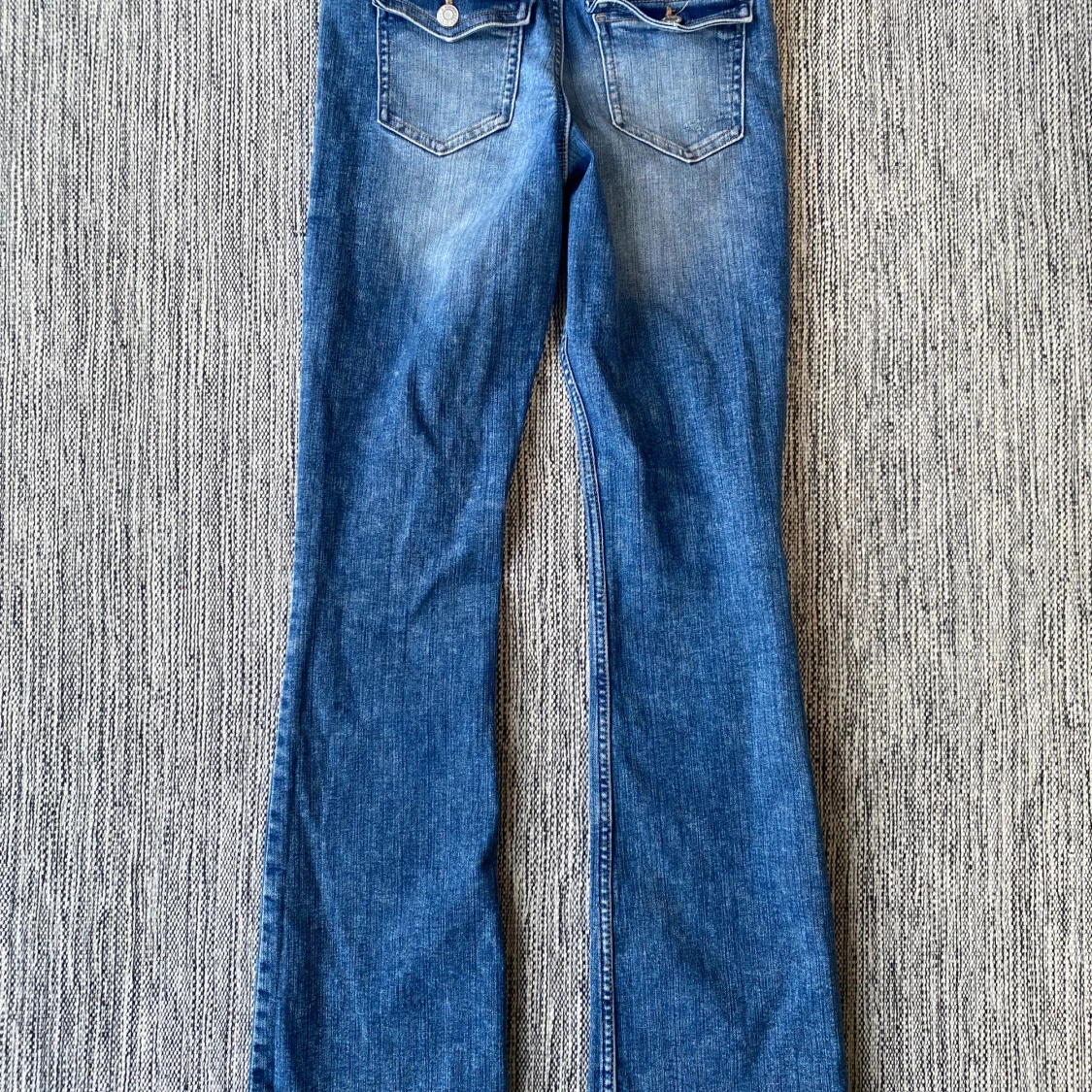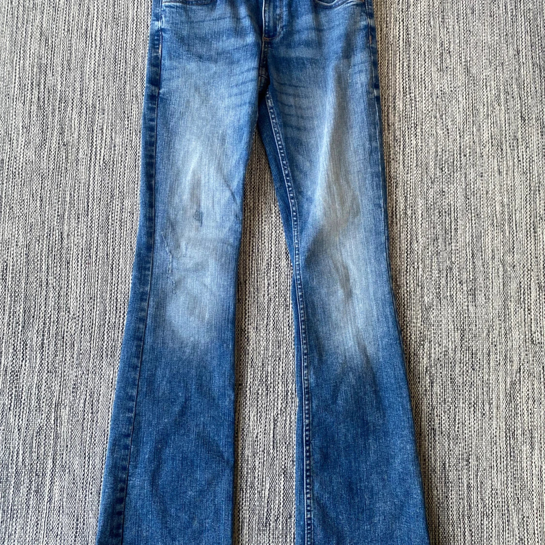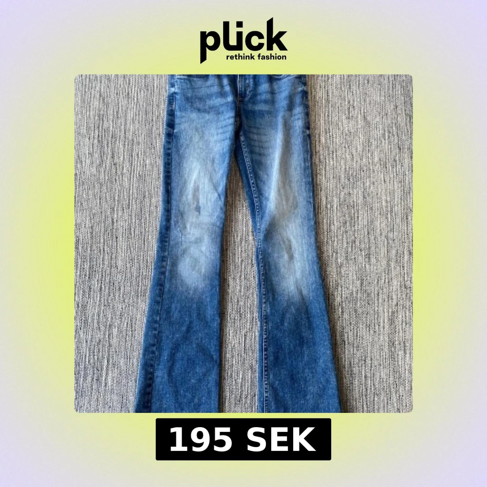 Snygga blå bootcut jeans från H&M med låg midja och justerbar midja. Klassisk femficksmodell med ljus tvätt och utsvängda ben. Materialet är en blandning av bomull och polyester med lite stretch för extra komfort. Mått Midjan: ca 36 cm Längd från grenen och ner: ca 82 cm 78% bomull, 20% polyester och 2% elastan Kommer från ett djur och rökfritt hem.