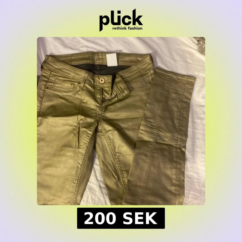 Snygga guldiga super skinny jeans från H&M med låg midja. Byxorna har klassisk femficksdesign, dragkedja och knapp framtill. Materialet är denim med en metallic finish som verkligen sticker ut.