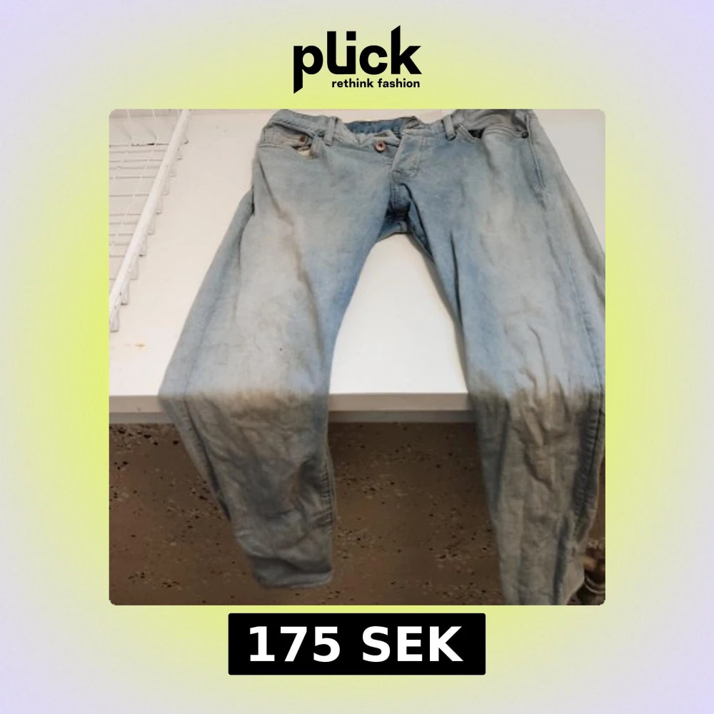 Säljer ett par ljusblå slim fit jeans från H&M i storlek 31/32. Jeansen har låg midja och klassisk femficksdesign. Tillverkade i bomull med en snygg tvättad look och smal passform hela vägen ner.