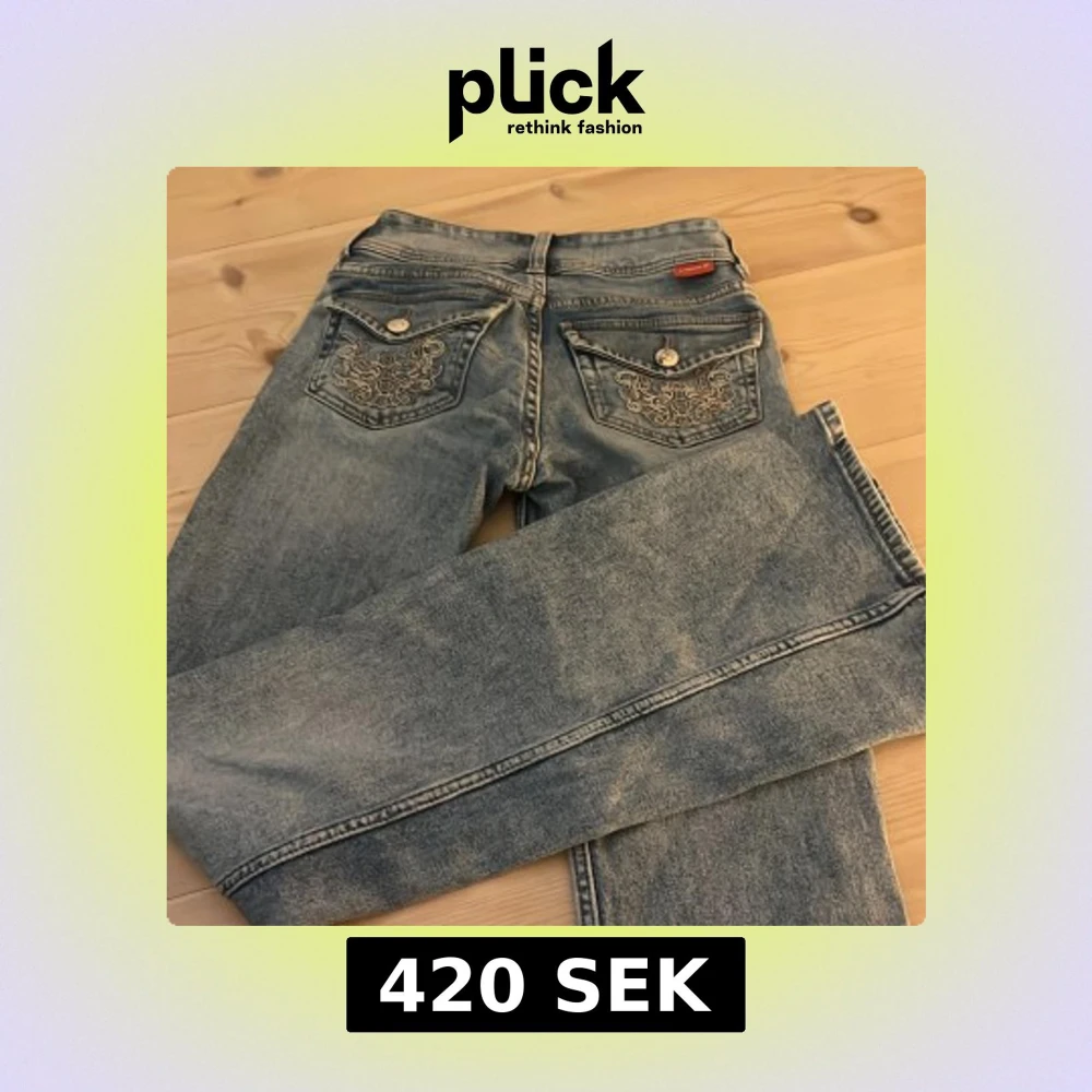 Snygga ljusblå bootcut jeans från H&M med broderade detaljer på bakfickorna och knappar. Jeansen har låg midja och klassisk femficksdesign. Materialet är jeans och passformen är bootcut. Perfekta!!💕
