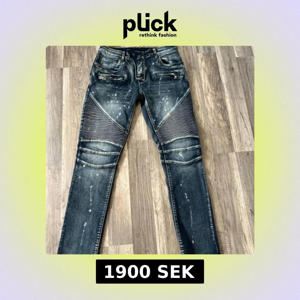 Snygga blå bikerjeans från Balmain med slitna detaljer, ribbade partier över knäna och coola dragkedjor vid fickorna. Jeansen har stänk-effekter och en smal passform som ger en edgy streetkänsla. Perfekta för dig som vill sticka ut.
