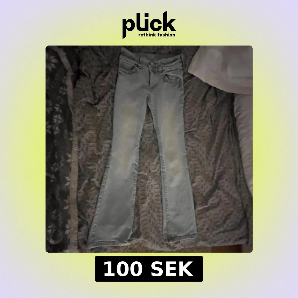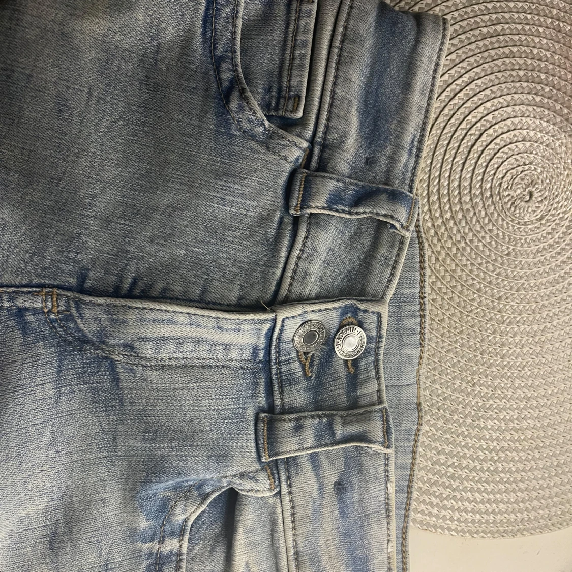 Säljer ett par ljusblå bootcut jeans med snygga dubbla knappar i midjan. Jeansen har utsvängda ben och coola sömdetaljer, perfekt för dig som gillar sthlm stil Materialet är klassisk denim och passformen är normal.