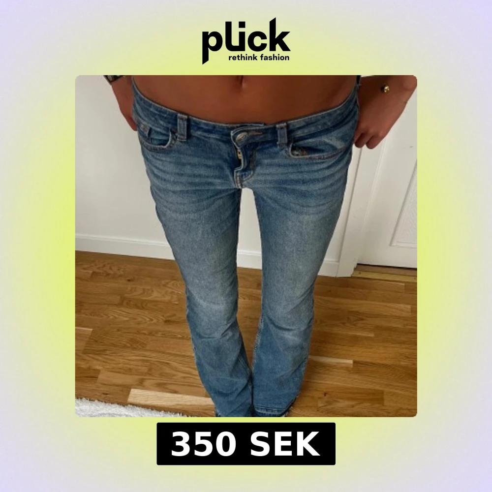 Säljer ett par klassiska blå jeans med snygg bootcut och låg midja. Jeansen har en lätt tvättad look och sitter tajt upptill med utsvängda ben. Skitsnygga! Sprättade längst ner
