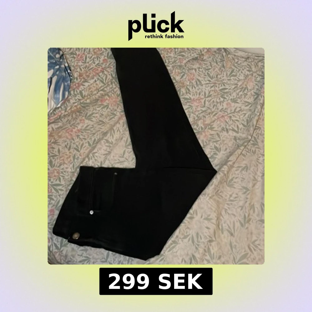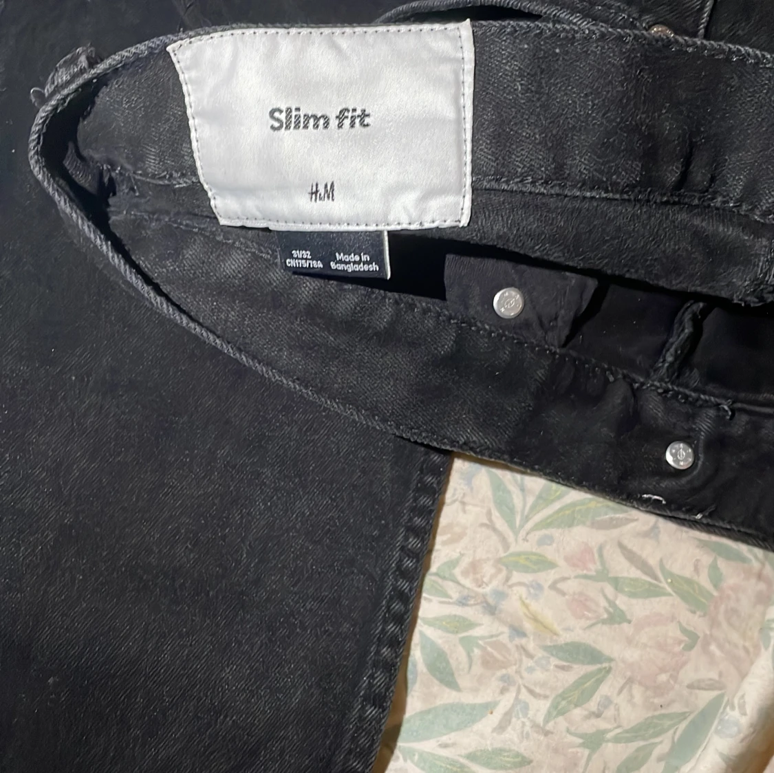 Svarta slim fit jeans från H&M med klassisk femficksdesign och raka ben. Jeansen har silverfärgade nitar och knapp, samt en diskret etikett på insidan. Snygg passform som sitter tajt men ändå bekvämt. Perfekta till en stilren look.
