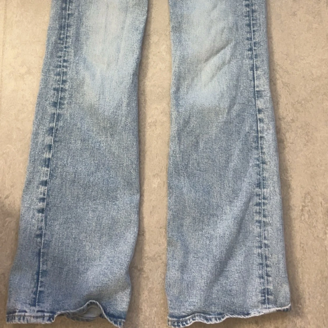 Säljer ett par ljusblå jeans med raka ben och snyggt slitna detaljer. Jeansen har klassisk femficksdesign och normal midja. Perfekta för en avslappnad och trendig look.