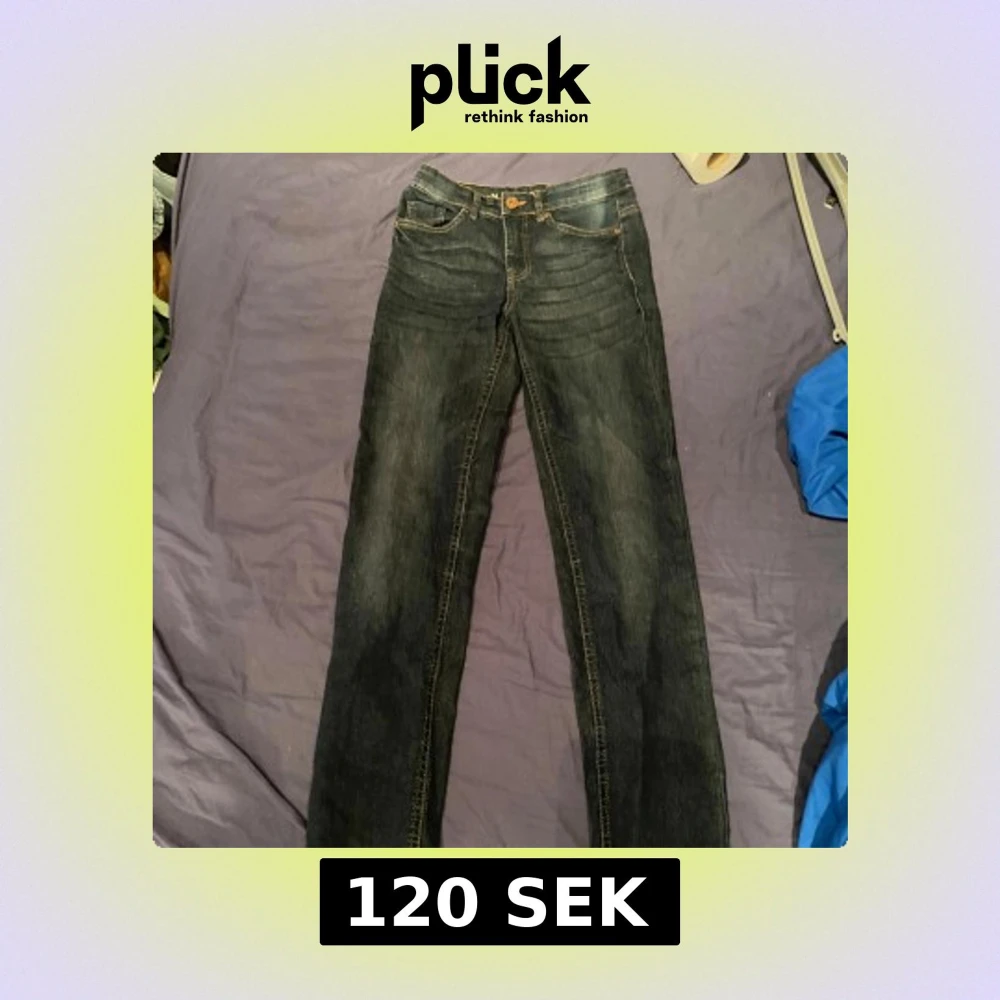 Säljer ett par mörkblå jeansbyxor med normal passform och hög midja. Byxorna har klassisk femficksdesign och stängs med en knapp och dragkedja. Perfekta för en avslappnad stil. Dom är lite utsvängda vid slutet av benen typ som bootcut.