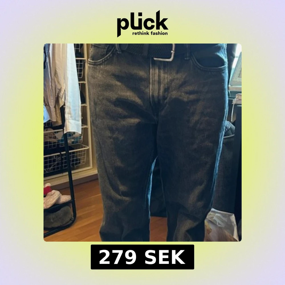 Säljer ett par mörkgråa jeans med rak passform och klassisk femficksdesign. Jeansen har normal midja och är tillverkade i ett robust denimtyg. Perfekta för dig som gillar en enkel och tidlös stil.