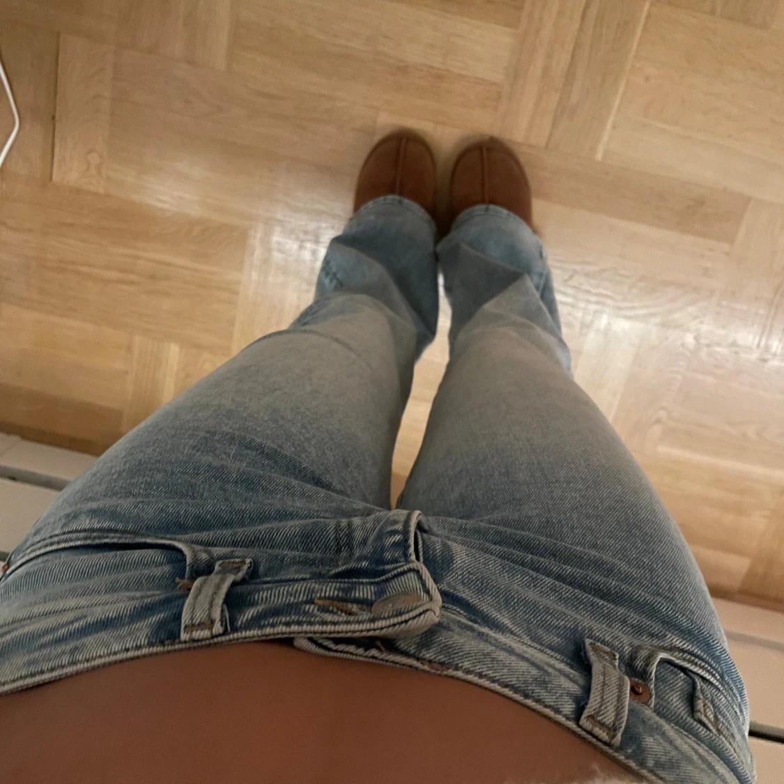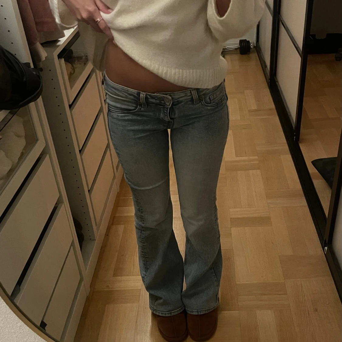 Säljer ett par riktigt snygga lågmidjade jeans i ljusblå tvätt. Jeansen har klassisk femficksdesign, bootcut-ben och sitter tajt upptill med lite utsvängda ben. Perfekta för dig som gillar en retro vibe och vill ha ett par jeans som sticker ut.