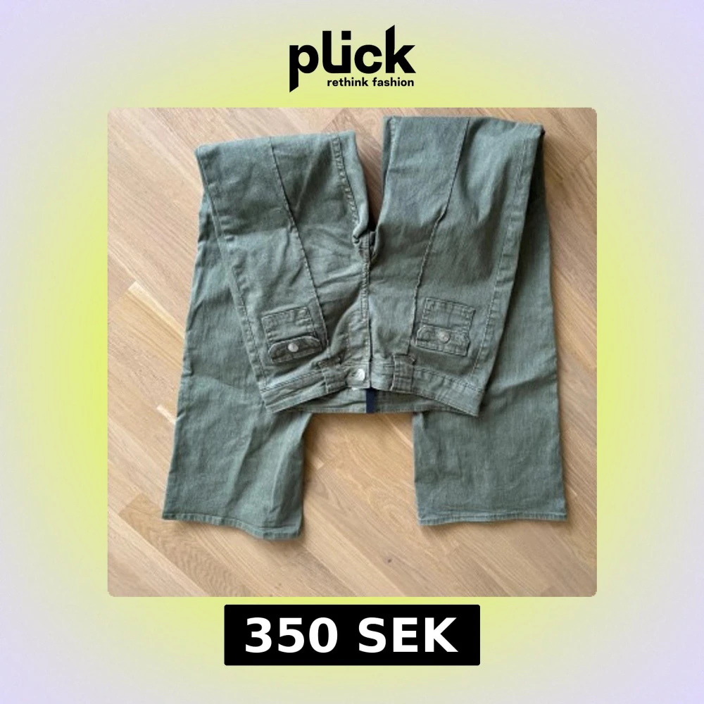 Snygga olivgröna jeans i storlek 34 med låg midja och två fickor framtill med lock och knapp. Byxorna har bälteshällor och stängs med knapp och dragkedja. Perfekta för en chill och avslappnad stil.